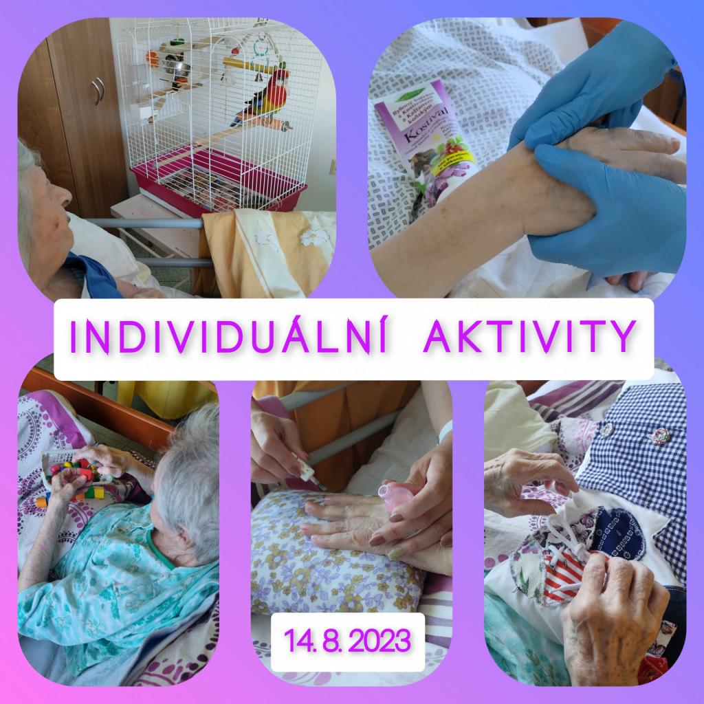 Individuální aktivity probíhají na pokojích imobilních klientů v průběhu celého dne, s přihlédnutím na jejich dřívější zvyky a aktuální přání a potřeby.