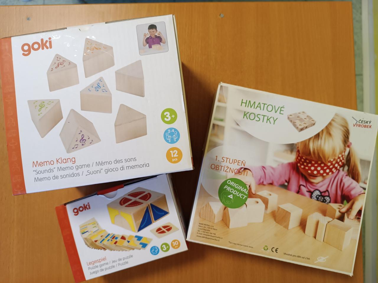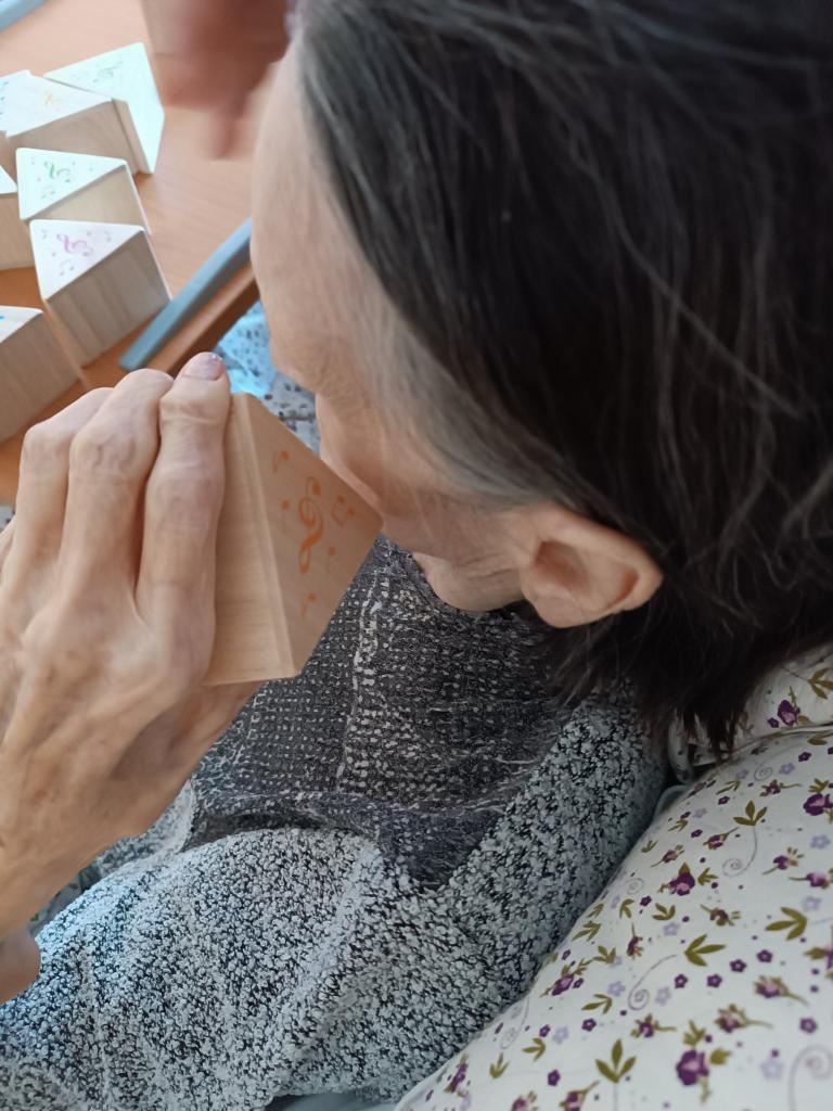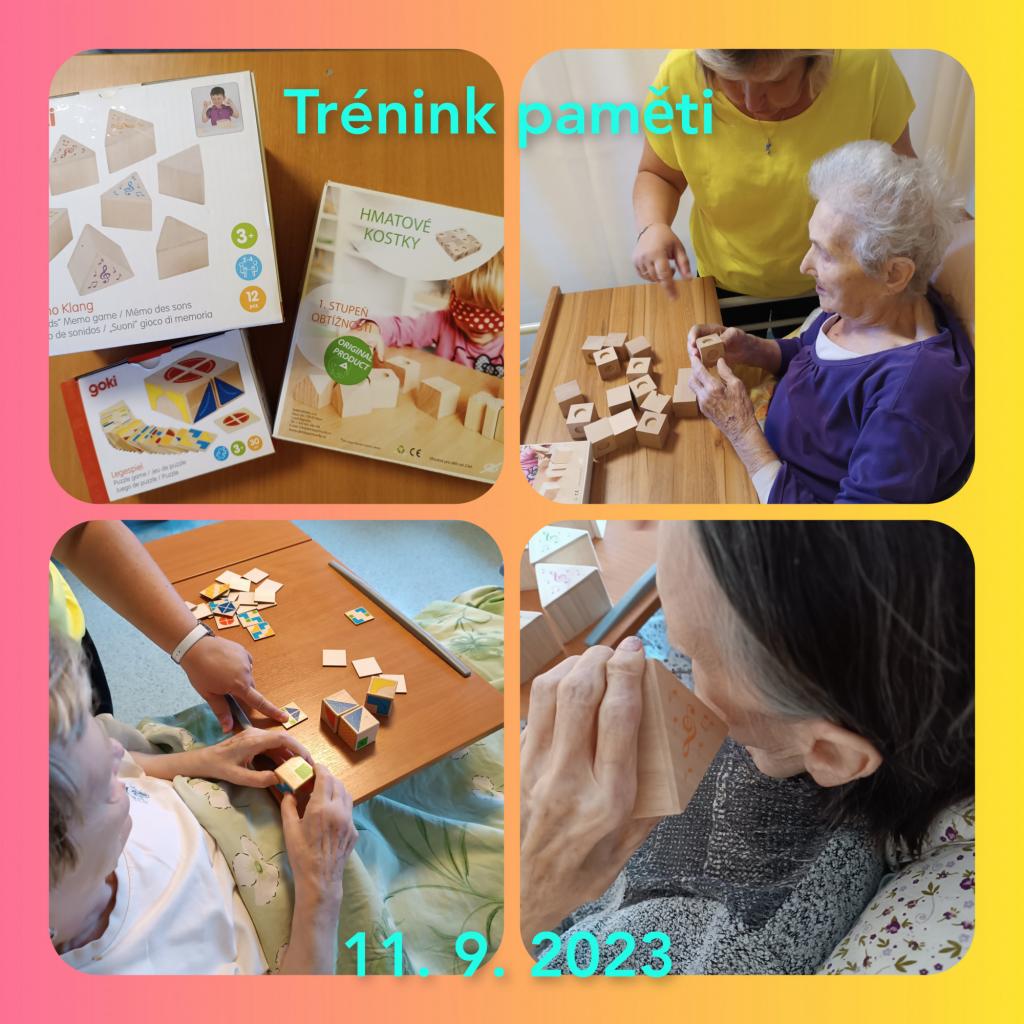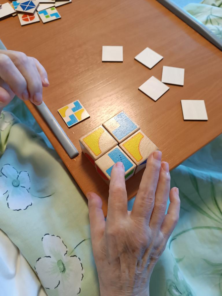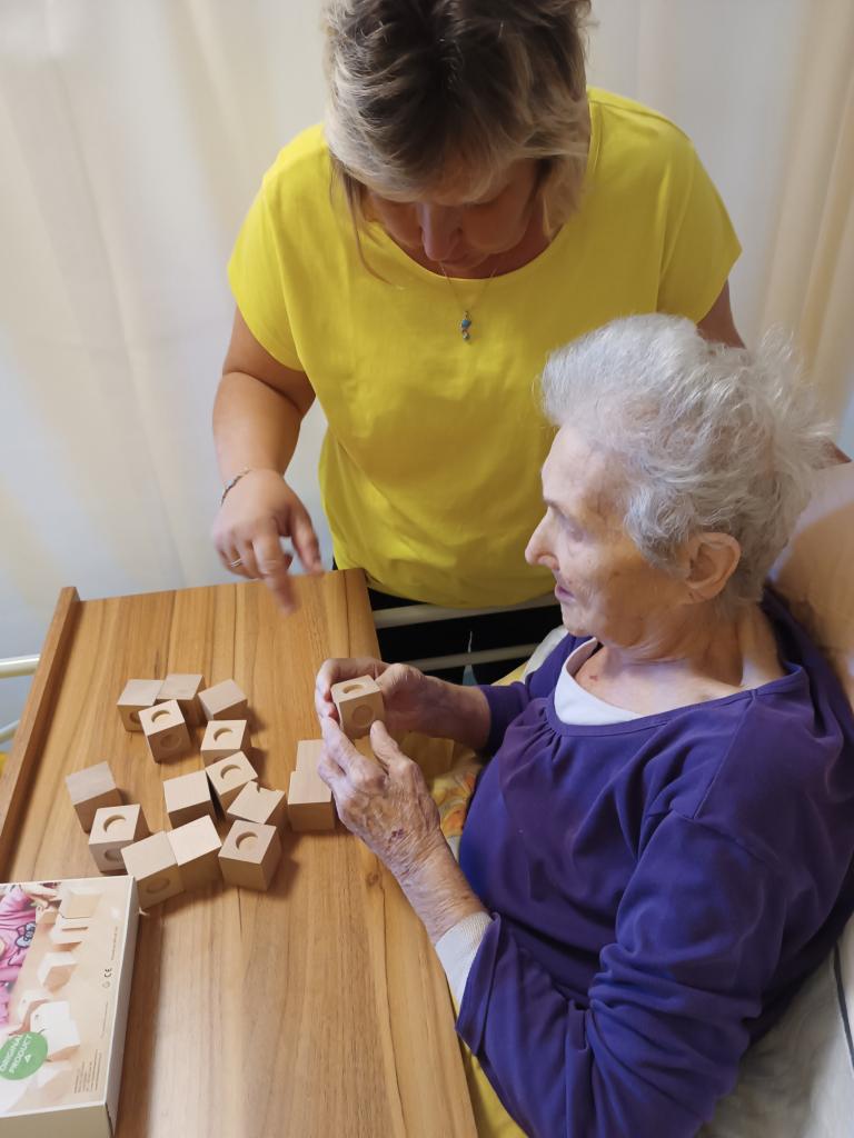 Dopoledne jsme využili nové pomůcky na trénink kognitivních funkcí. Hudební pexeso, hmatové dřevěné kostky a puzzle vyzkoušeli klienti na pokojích. Hrou tak zapojili základní smysly jako je sluch, hmat a zrak.