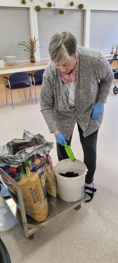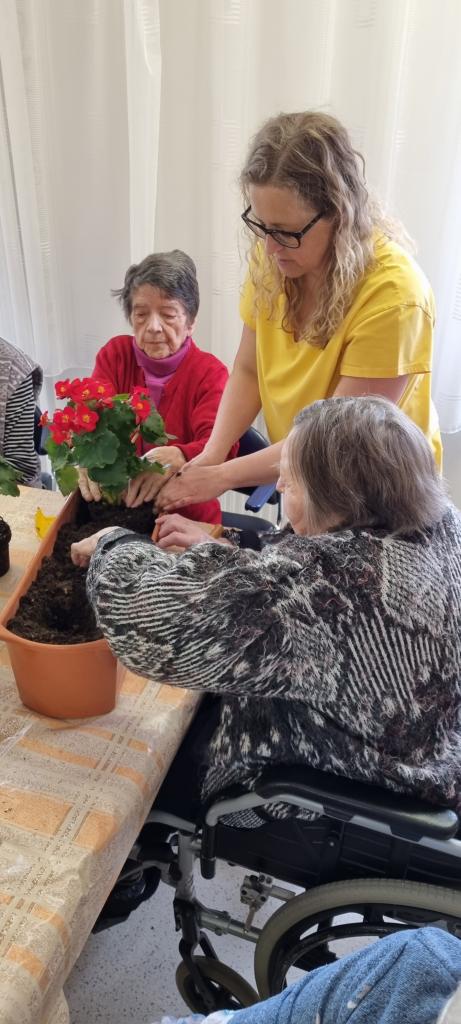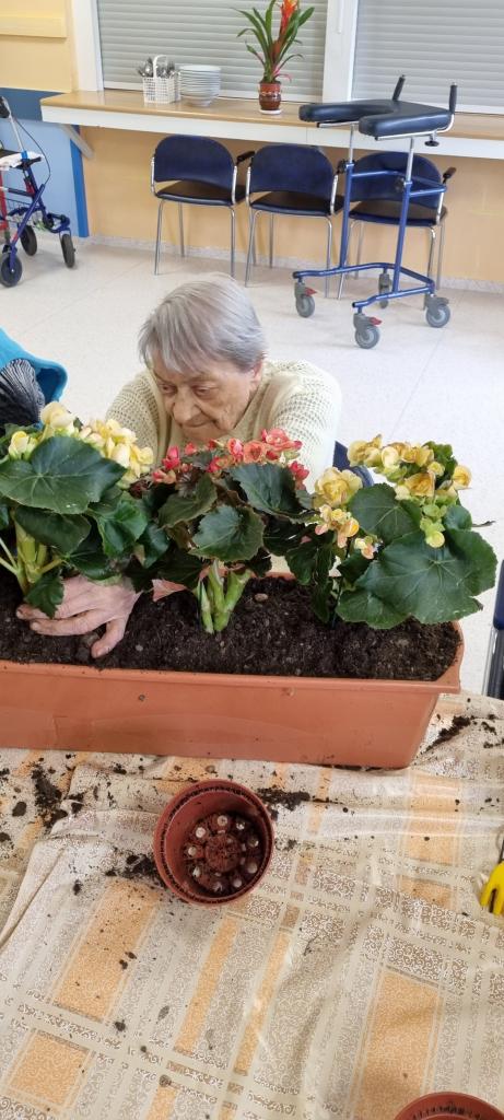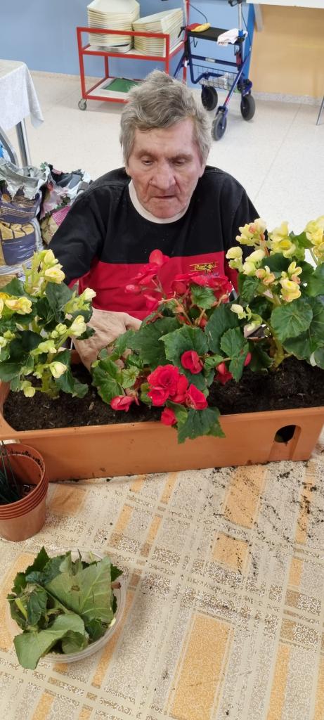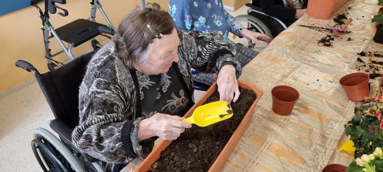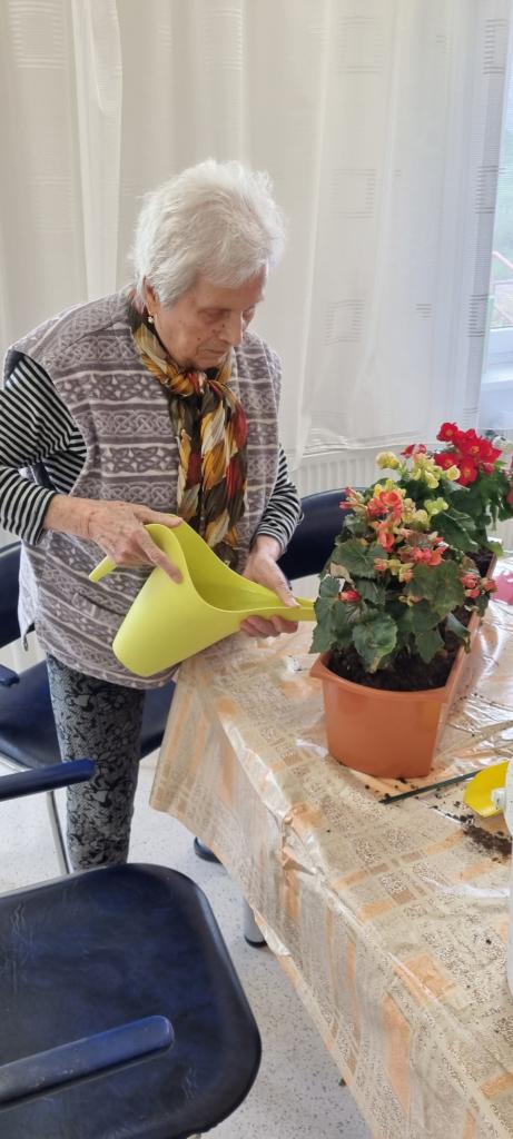 Nepříznivé počasí venku nás neodradilo a společně jsme se v jídelně pustili do přesazování venkovních květin. Každý z klientů se zapojil dle svých možností.