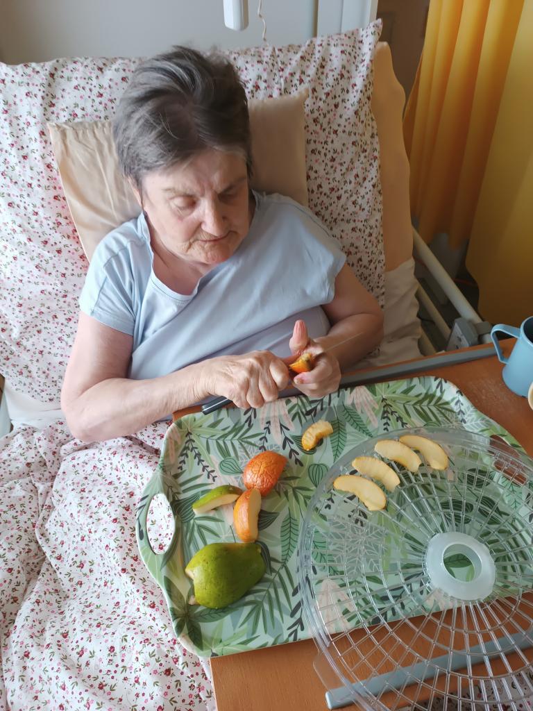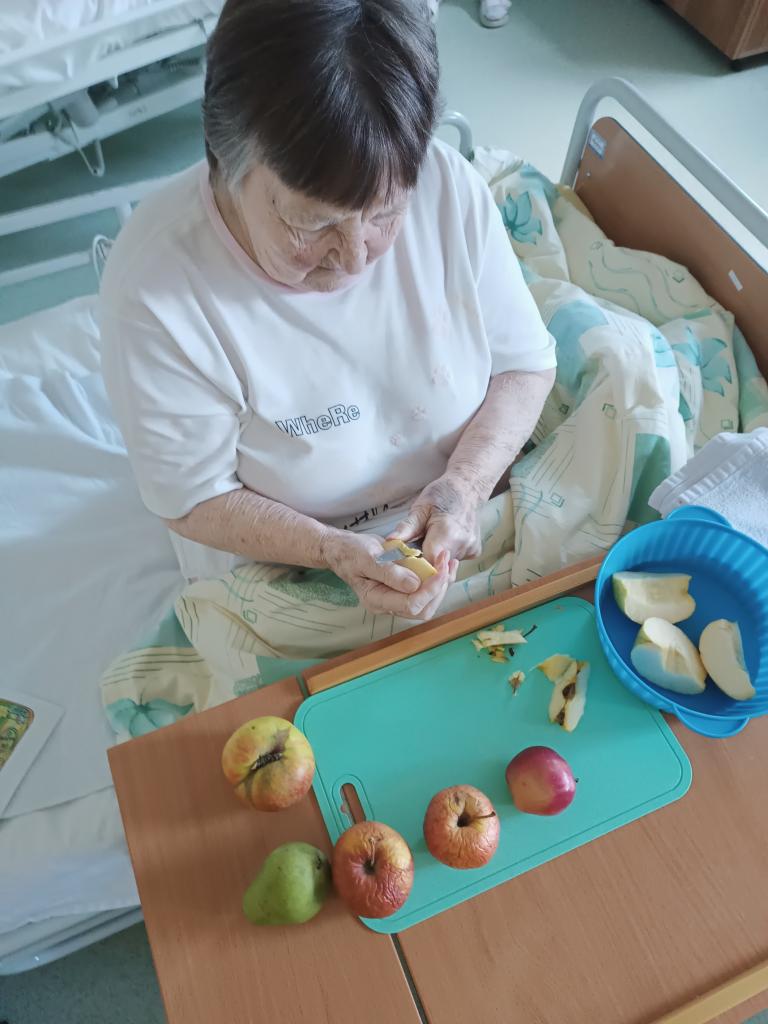 K podzimu patří sběr jablek. Společně jsme se dnes při smyslové aktivizaci věnovaly zpracování jablek, povídání a vzpomínání. Nechyběly ani písničky o nich. Už teď se všichni těšíme až usušené jablka ve formě křížal ochutnáme.