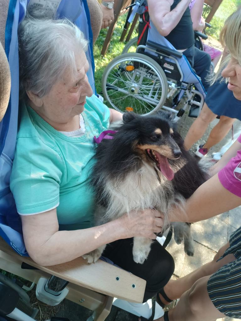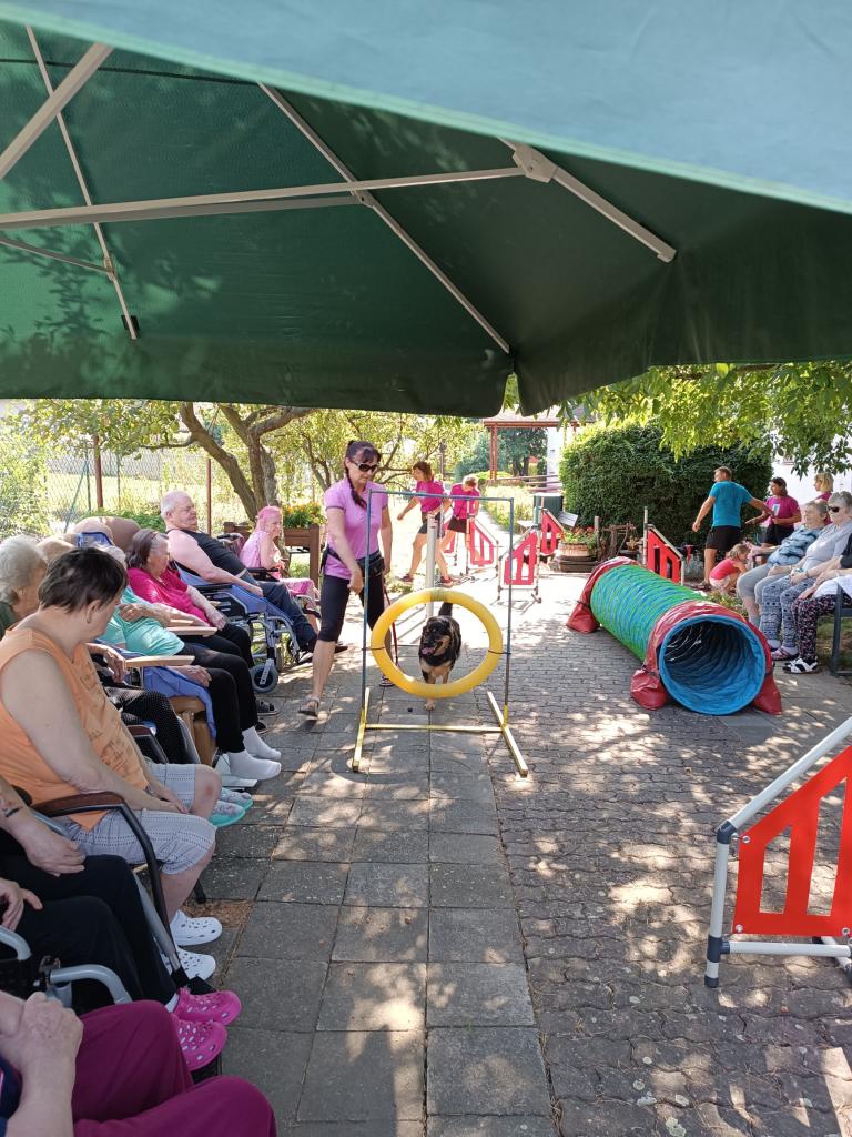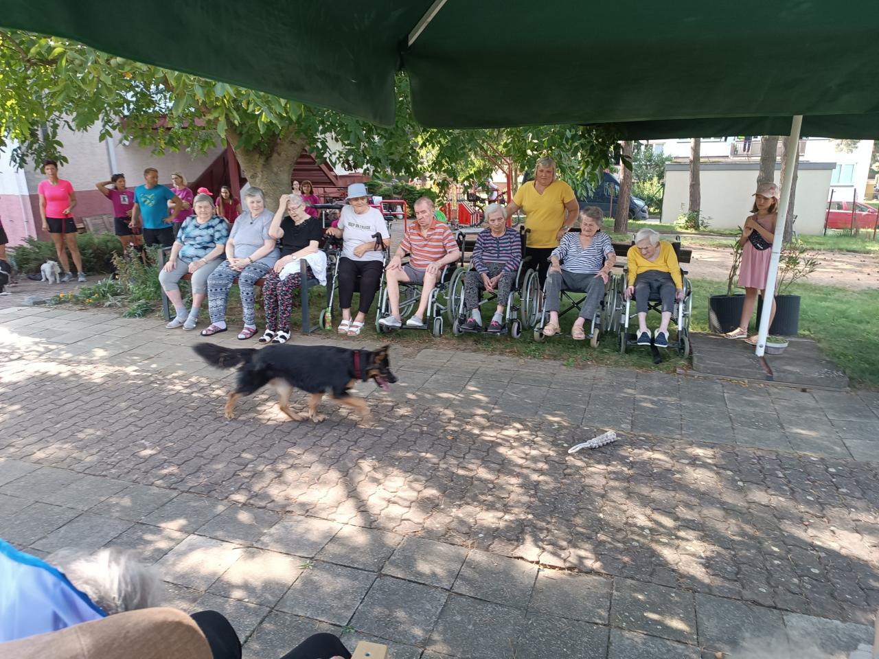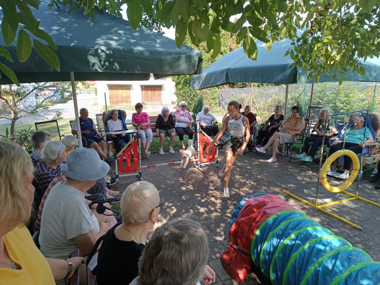 Odpoledne nám zpříjemnila návštěva spolku Agility Napajedla. Psovodi s jejich čtyřnohými mazlíčky nám předvedli povely, cvičení přes překážky a další naučené triky. Psi každého klienta pozdravili a klienti si psy pohladili.