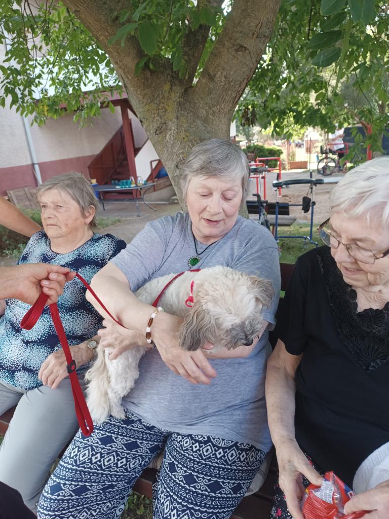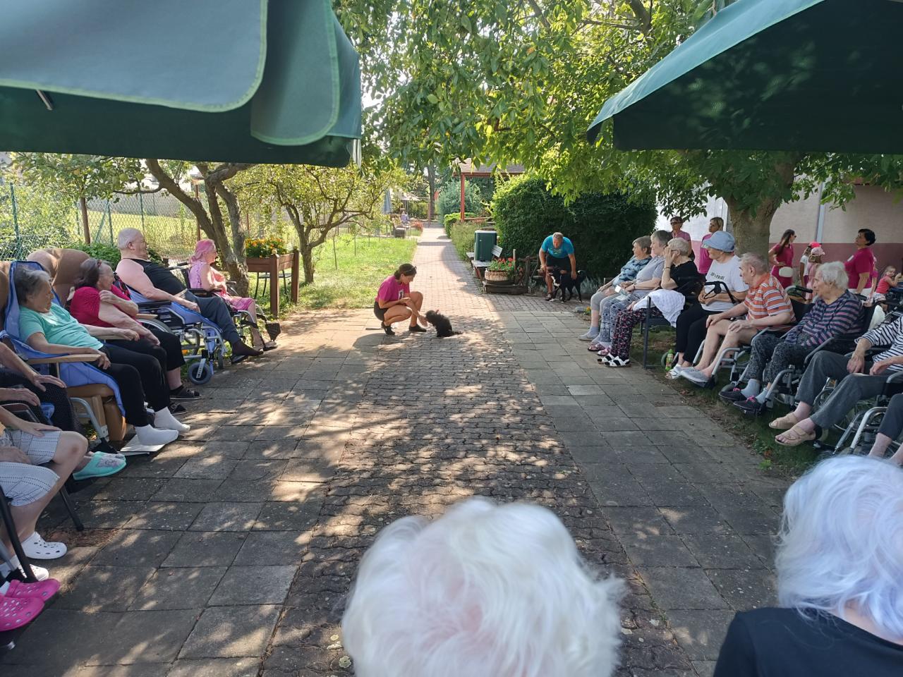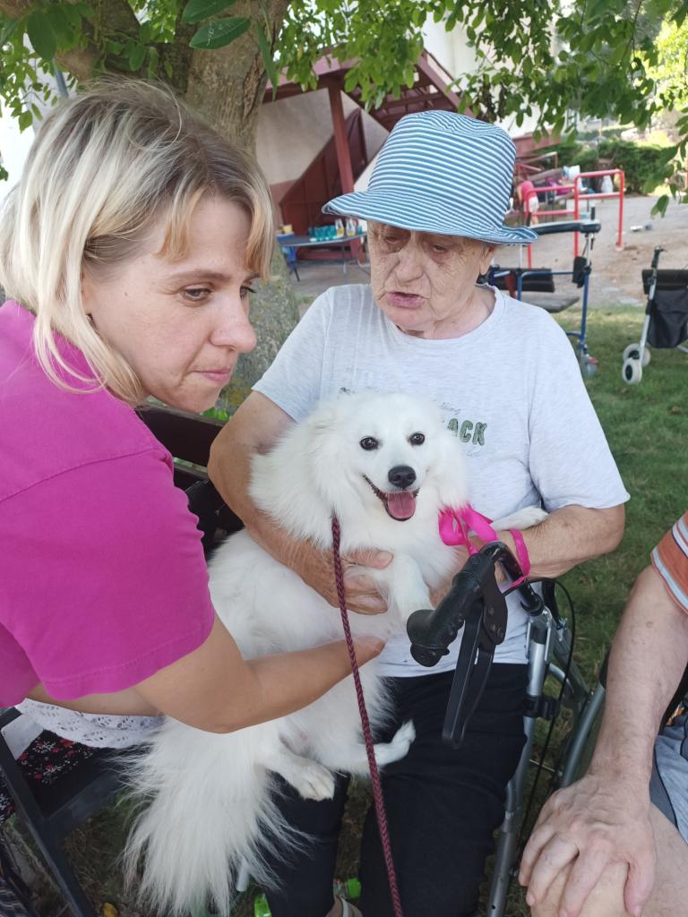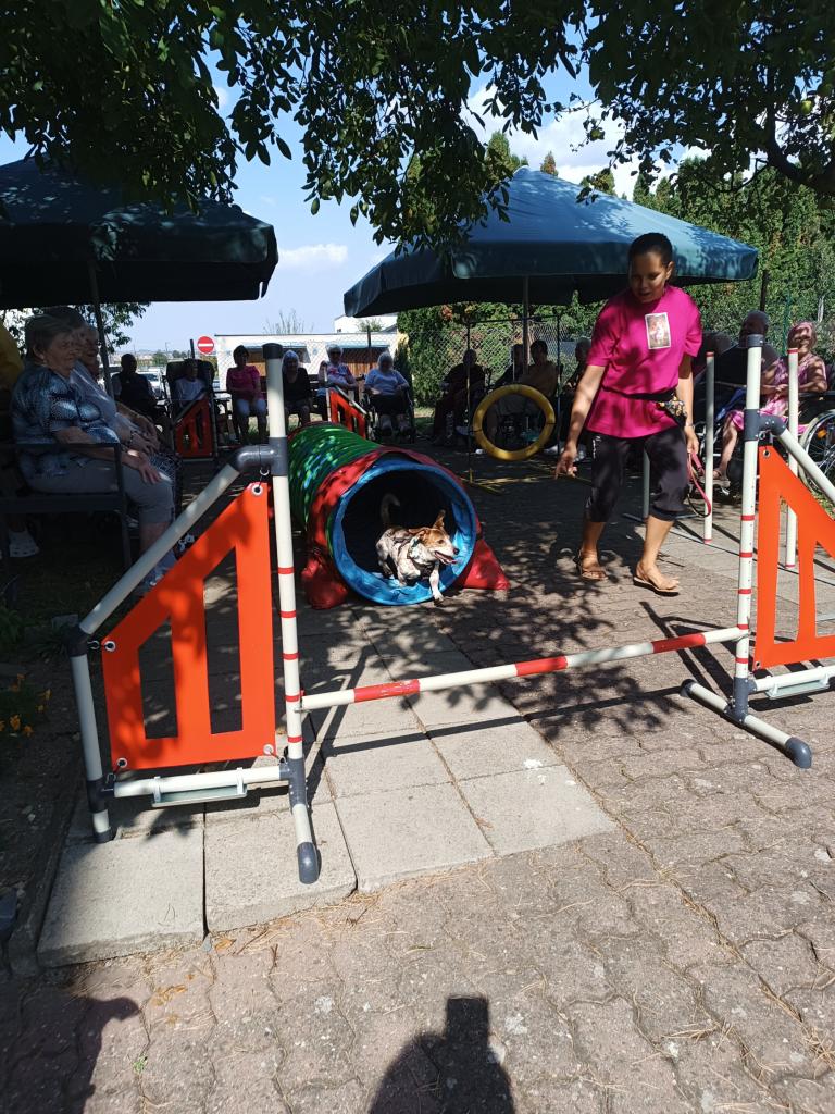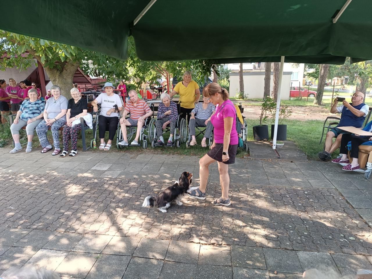 Odpoledne nám zpříjemnila návštěva spolku Agility Napajedla. Psovodi s jejich čtyřnohými mazlíčky nám předvedli povely, cvičení přes překážky a další naučené triky. Psi každého klienta pozdravili a klienti si psy pohladili.