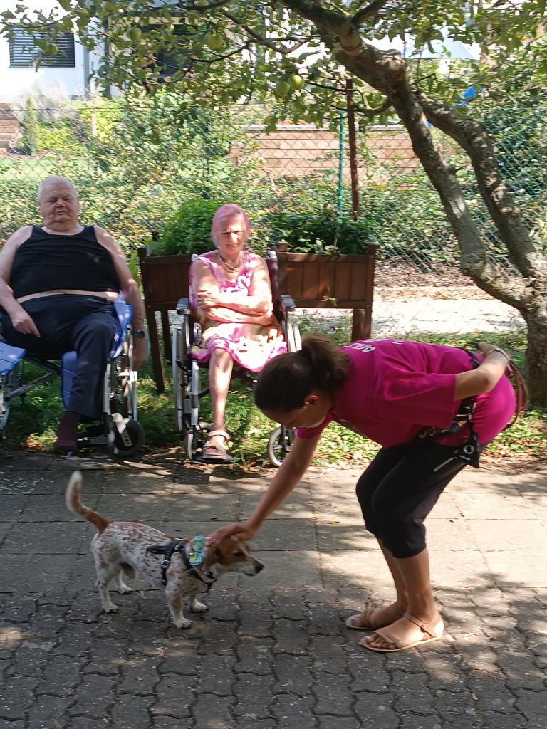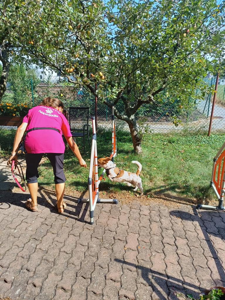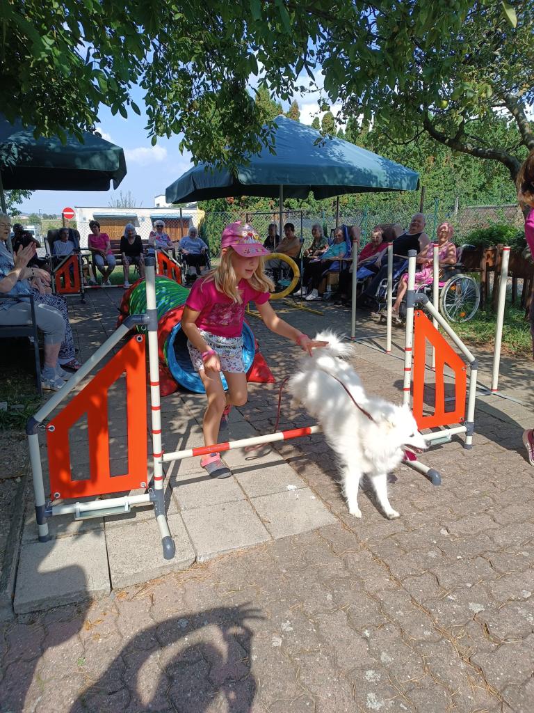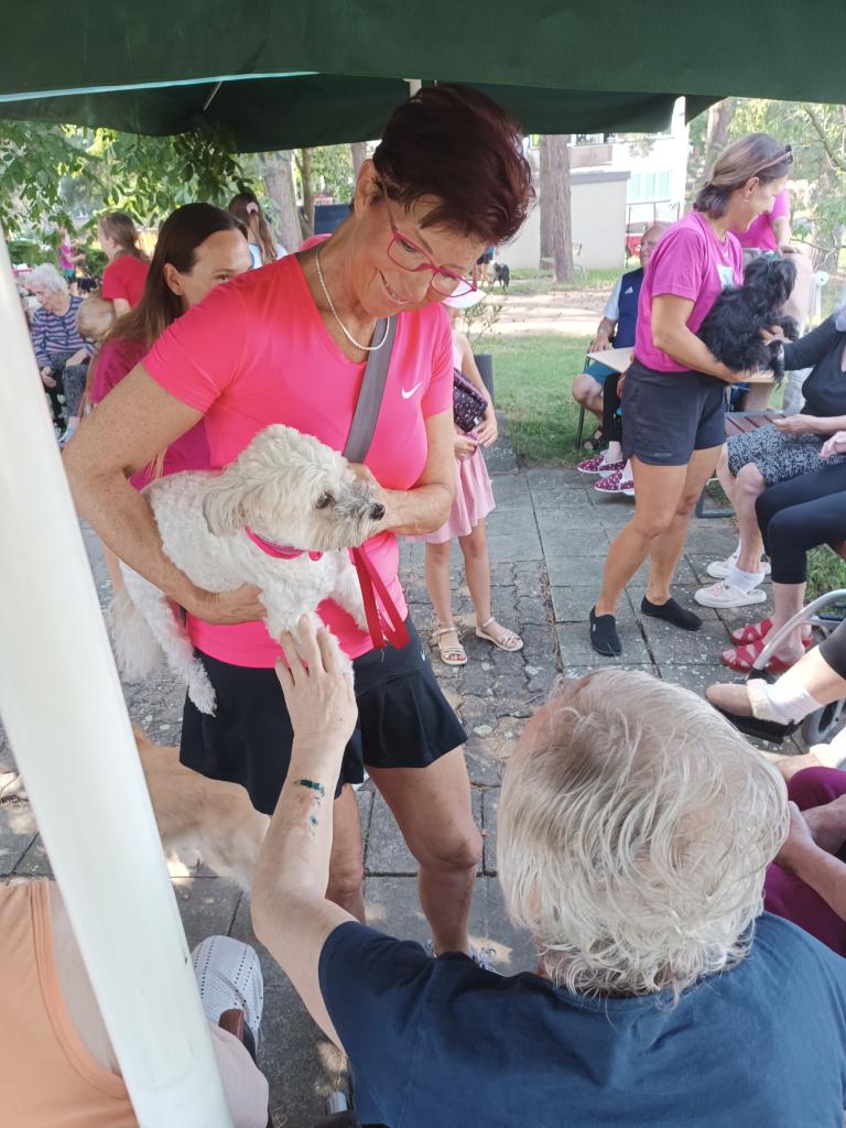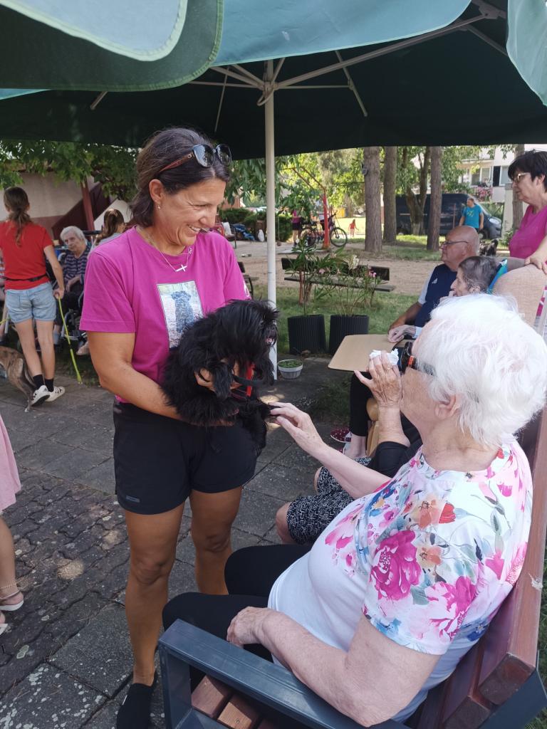 Odpoledne nám zpříjemnila návštěva spolku Agility Napajedla. Psovodi s jejich čtyřnohými mazlíčky nám předvedli povely, cvičení přes překážky a další naučené triky. Psi každého klienta pozdravili a klienti si psy pohladili.