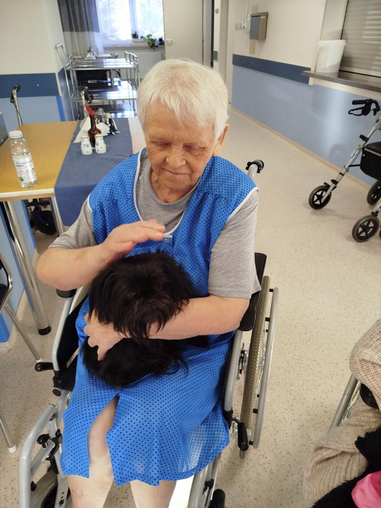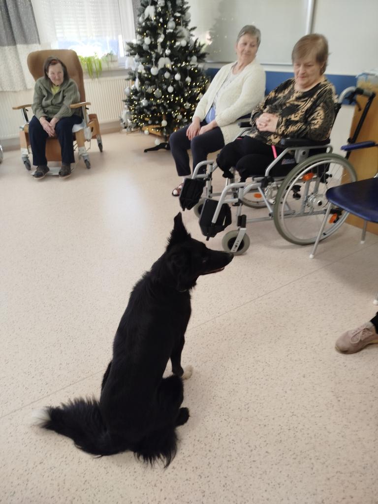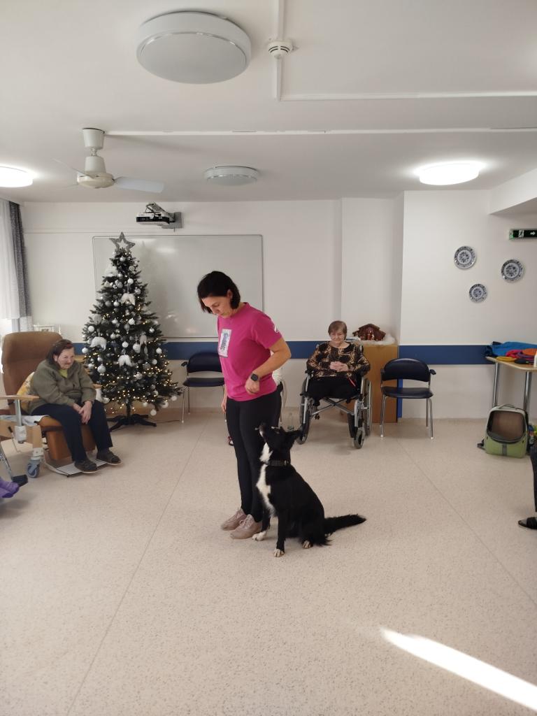 Dopoledne nám zpestřila paní Šulcová z Agility Napajedla se svými fenkami. Ty nám předvedly nacvičené povely, nechaly se pohladit. Taky nám udělaly módní přehlídku ve vánočních čepičkách.