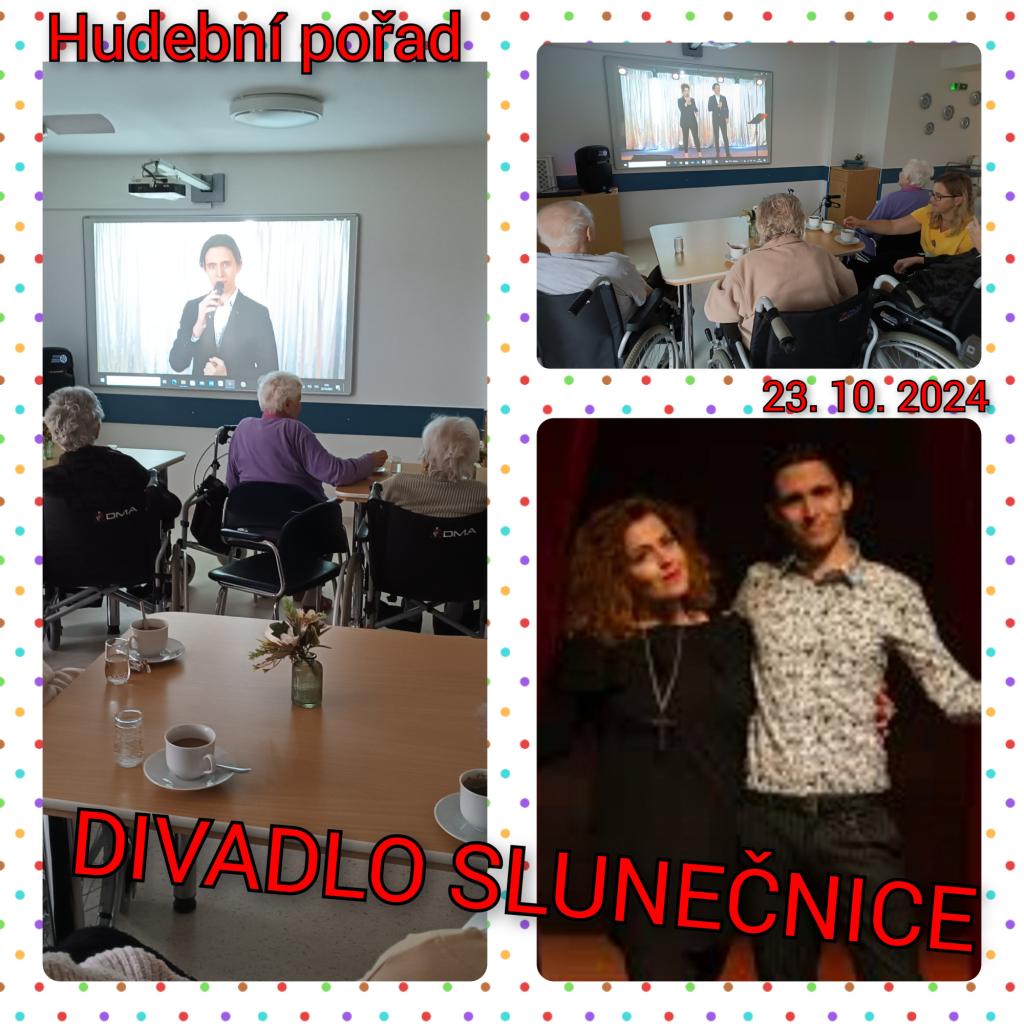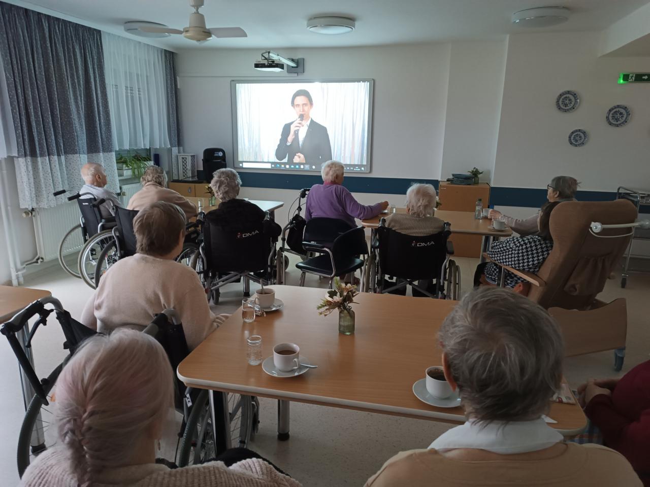 Hudební pořad v podání pěveckého dua z divadla Slunečnice jsme shlédli v jídelně na velkém plátně. Pohodovou atmosféru podtrhlo posezení u kávy a vzpomínání na songy dávno minulé.