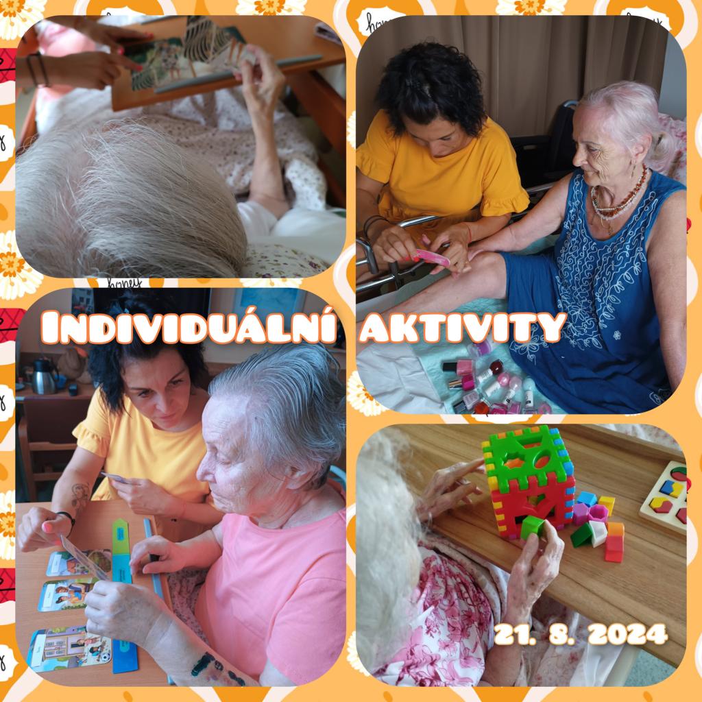 Individuální aktivity probíhají zejména na pokojích imobilních klientů v průběhu celého dne, s přihlédnutím na jejich dřívější zvyky a aktuální přání a potřeby.