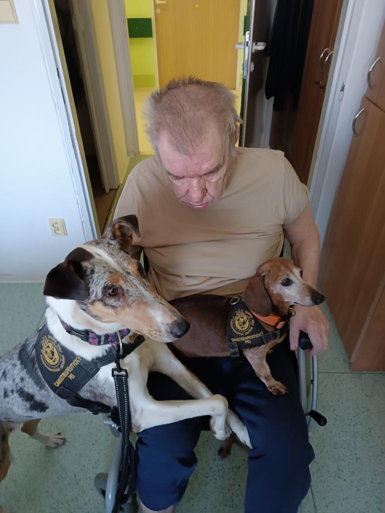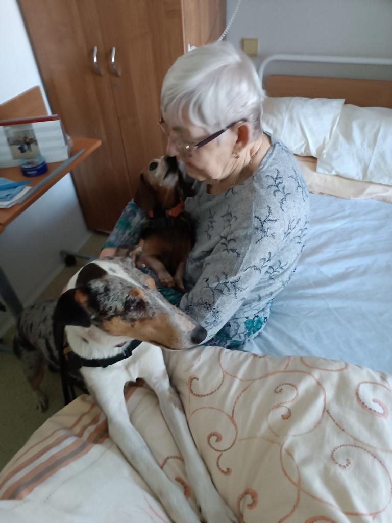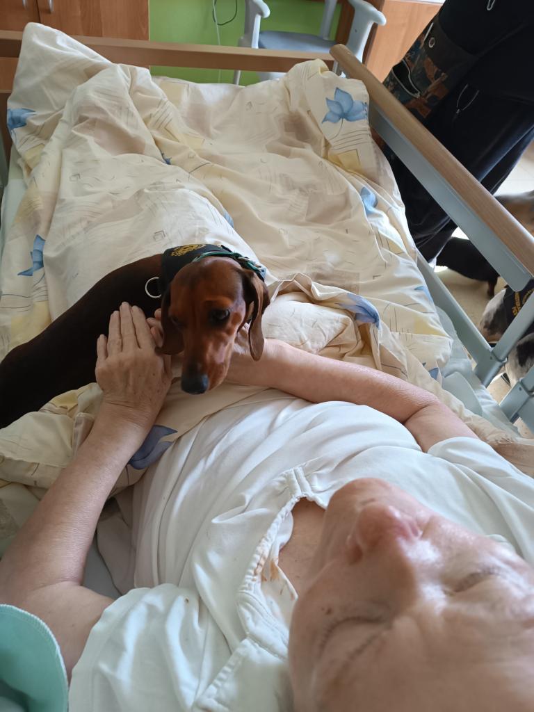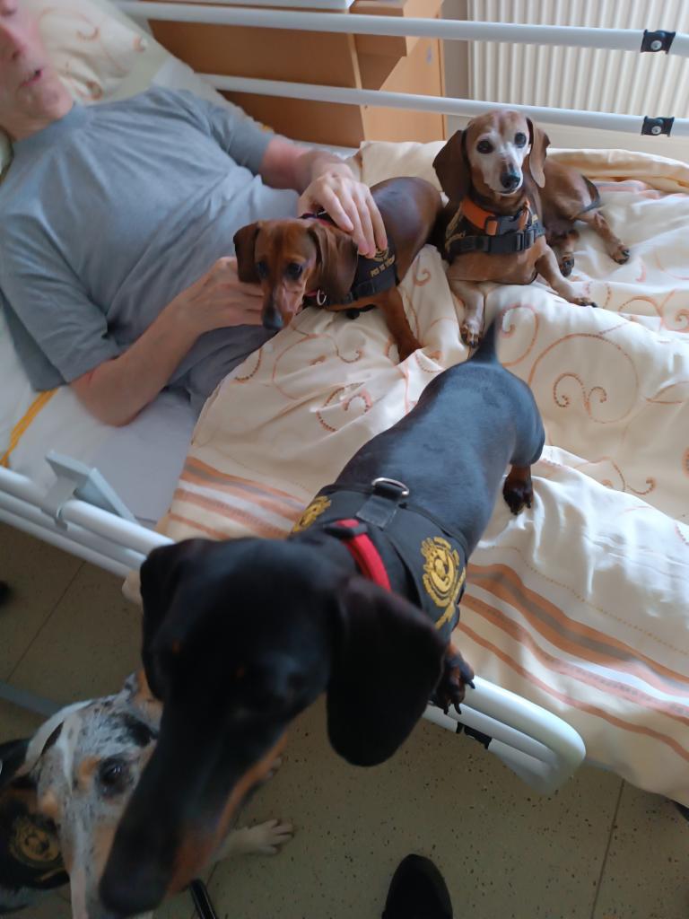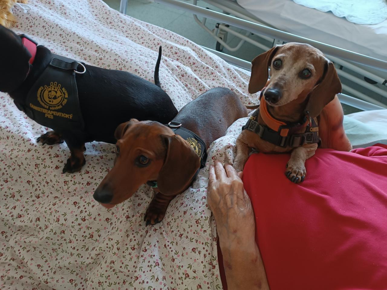 Klienty na pokojích opět potěšila návštěva jezevčíků a hladkosrstá kolie v rámci canisterapie. Jejich návštěva všem vykouzlila úsměv na tváři.