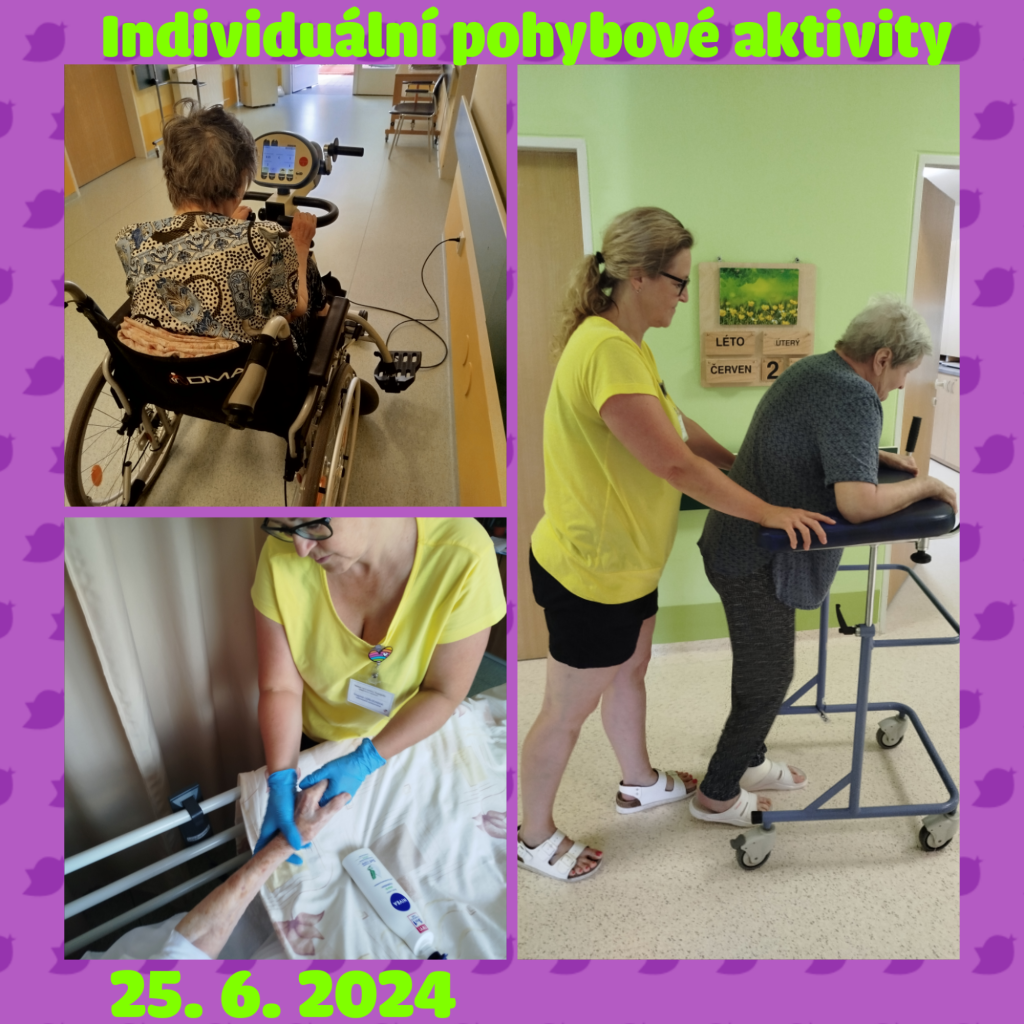 Pravidelně se věnujeme klientům na pokojích i mimo ně při individuálních aktivitách jako je cvičení, promazání, nácviky chůze a jízda na motomedu. Aktivity jsou vždy vedeny dle potřeb a přání klientů.