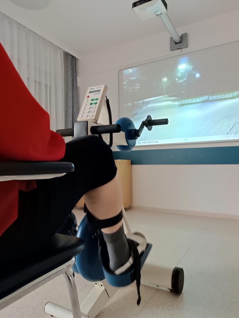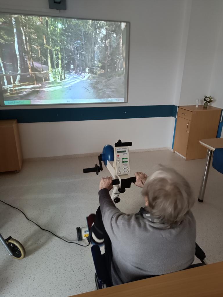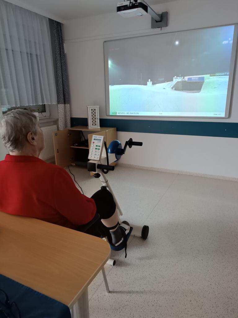 Projet se ve městě nebo přírodou? Ano, na přání našich klientů jsme využili pohybovou terapii, kdy procvičili horní i dolní končetiny při simulaci jízdy na kole společně s videoprojekcí vybrané krajiny nebo projížďky ve městě.