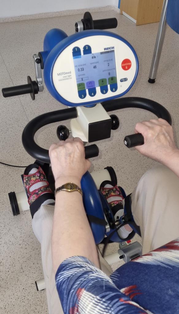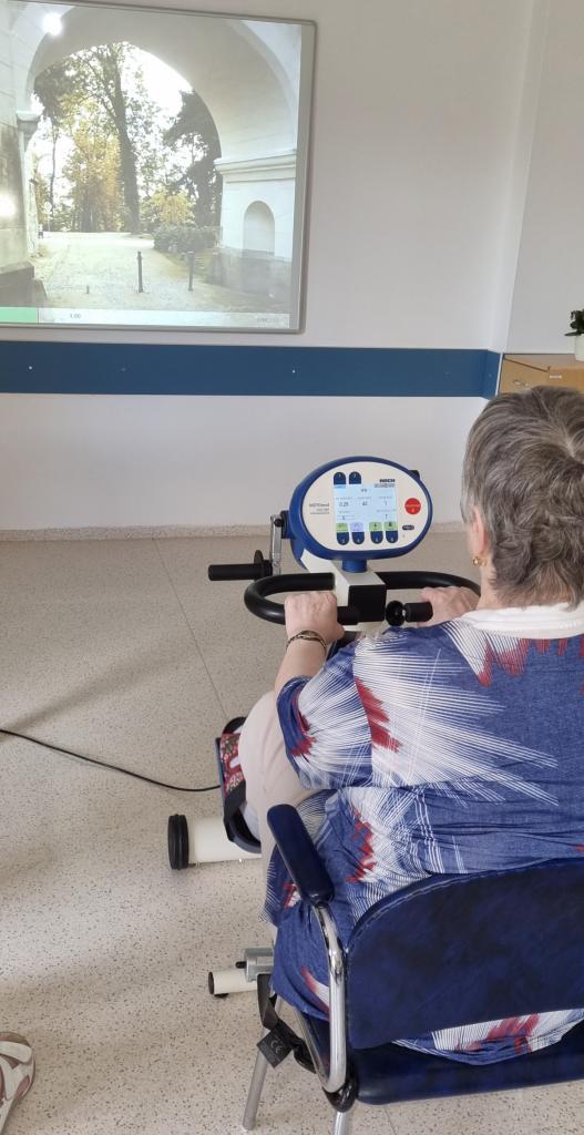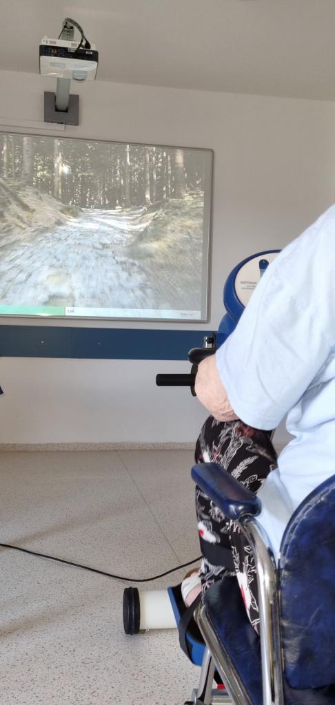 Simulace jízdy na kole pro trénink dolních končetin spojený s výletem do přírody nebo do města. Tak si klienti zpříjemnili úterní odpoledne.