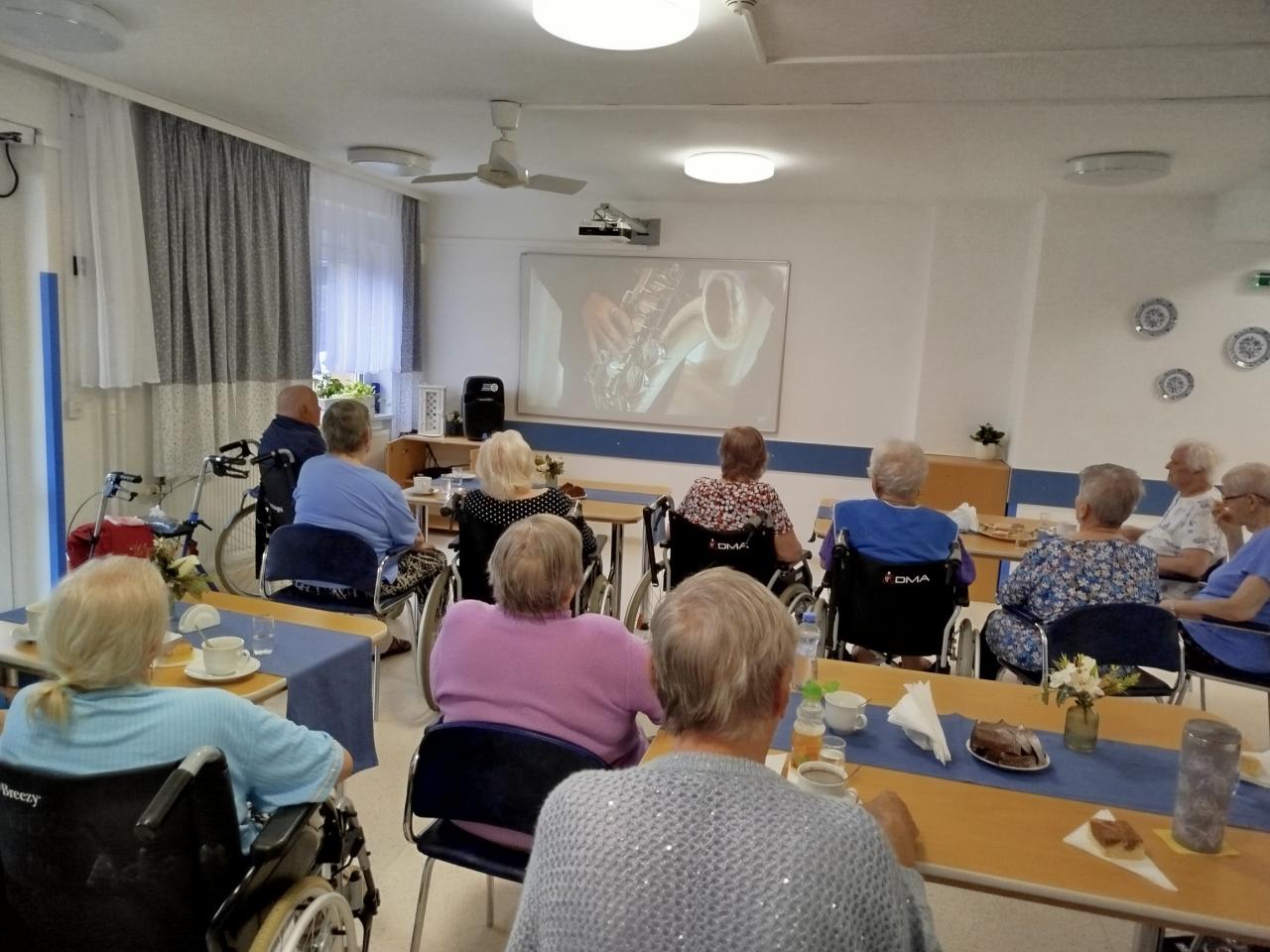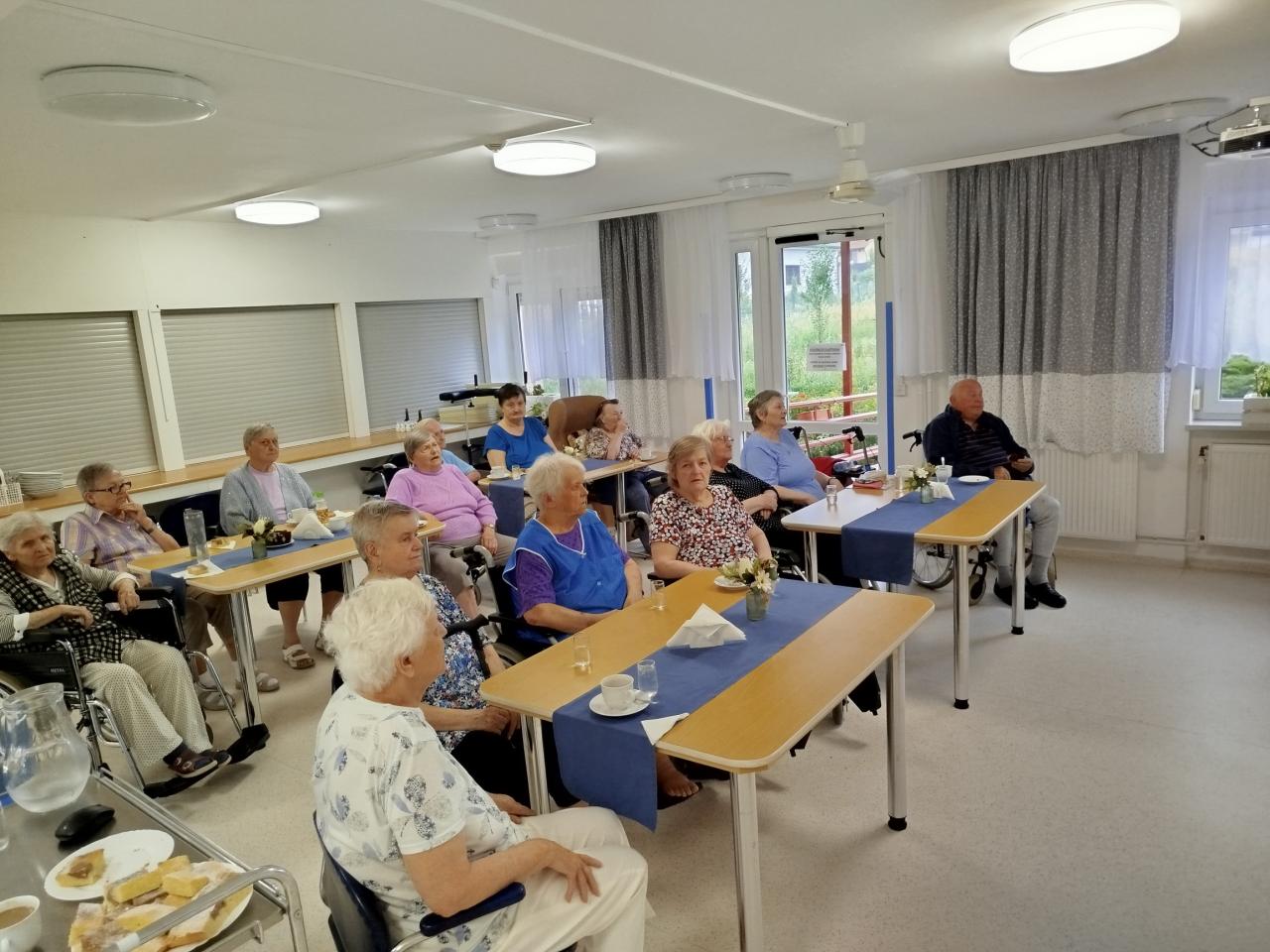 Jedna z oblíbených společných aktivit je zpívání a poslech písniček. Klienti si při hraní na přání vždy vybírají své oblíbené a taky si u toho rádi zazpívají. Ke kávě si pochutnali na buchtách, které jsme včera napekli.