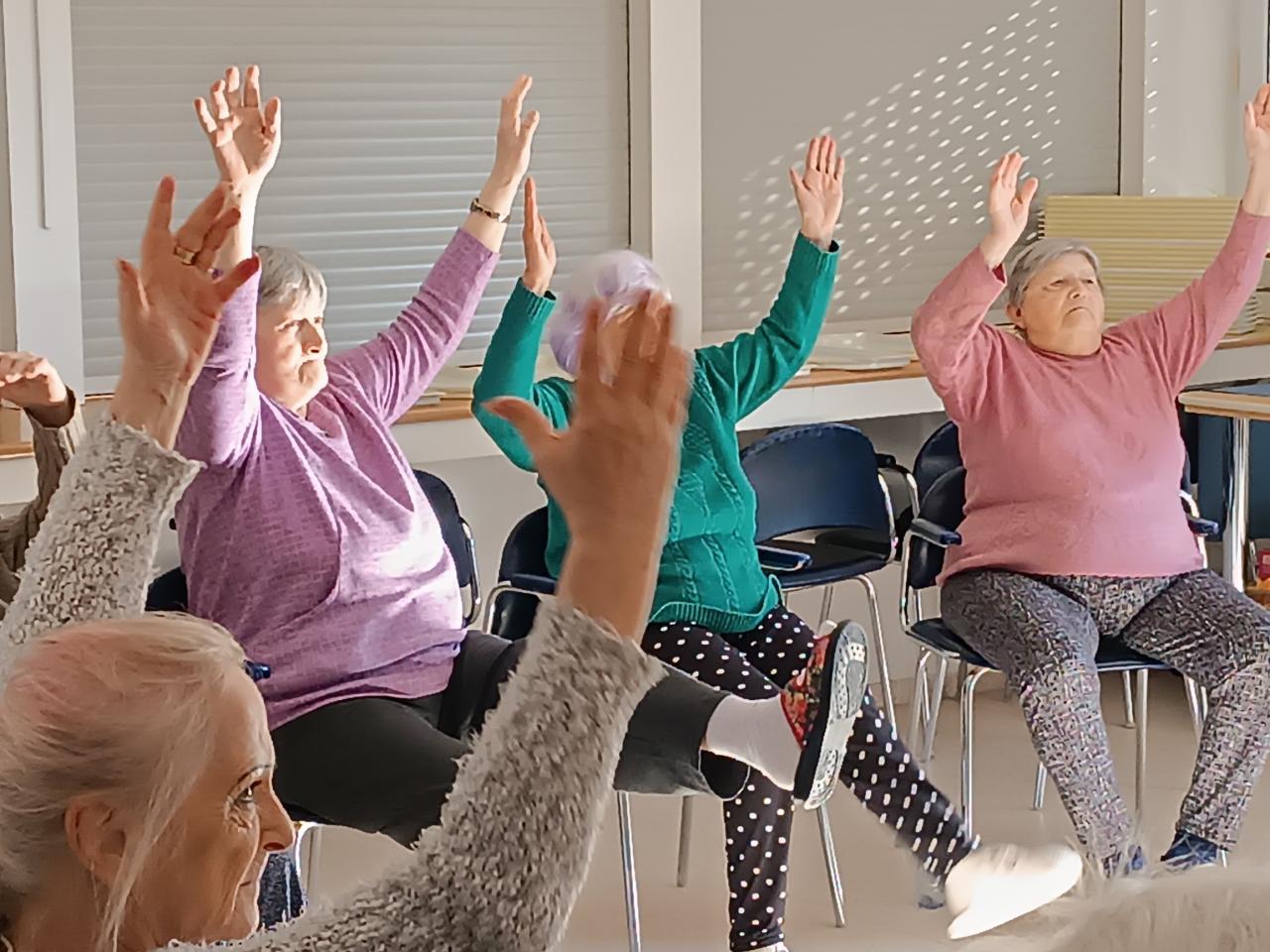 Při společných pohybových aktivitách jsme si na projektoru pustili záznam rozcvičky s panem Veletou. Taky jsme si zatančili na židlích a procvičili tak celé tělo. Zavzpomínali jsme na jeho taneční vystoupení.