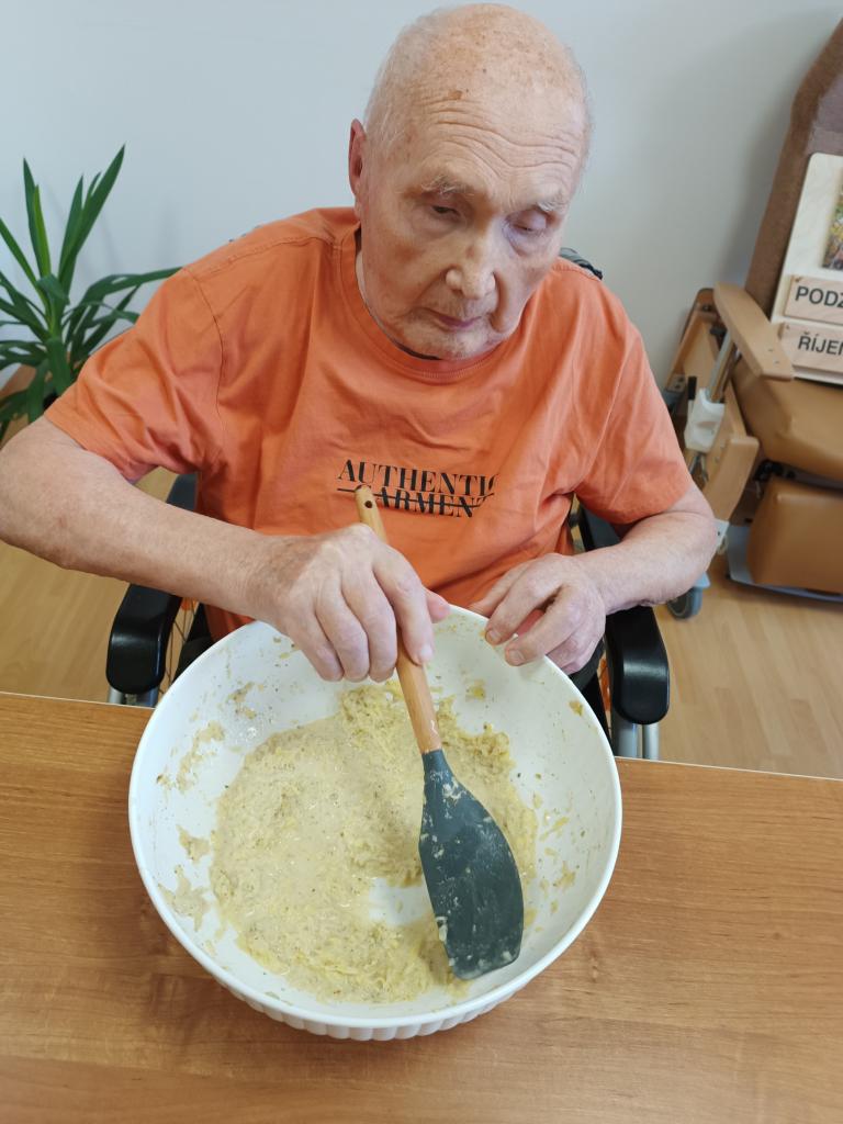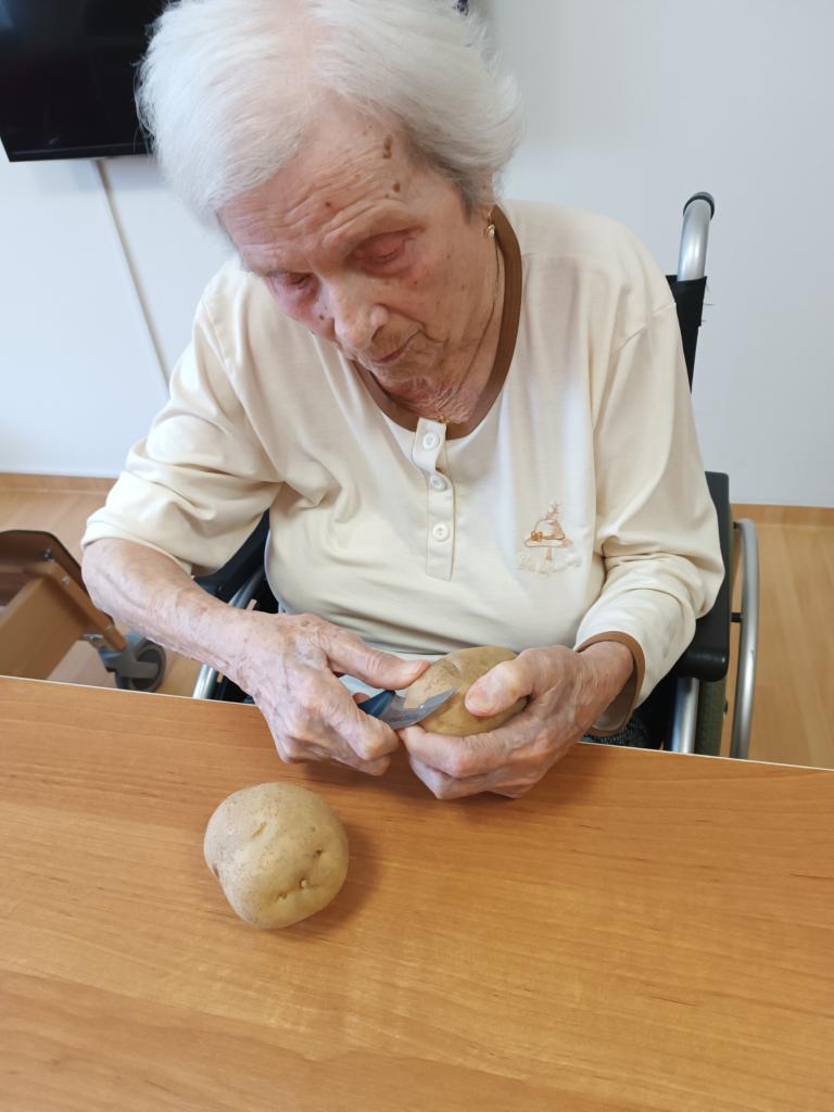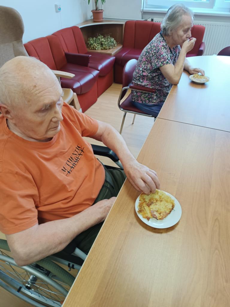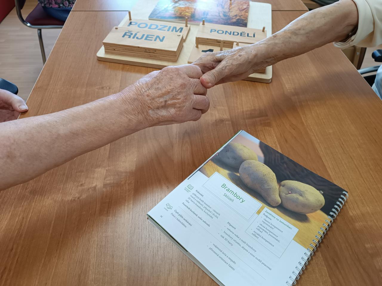 Klienti v malé skupince si připravili bramborové placky se zelím. Zavzpomínali, co vše z brambor připravovali, ale taky samotné pěstování a sklizeň zeleniny, přípravu zahrady a pole na zimu. Na plackách si všichni pochutnali.