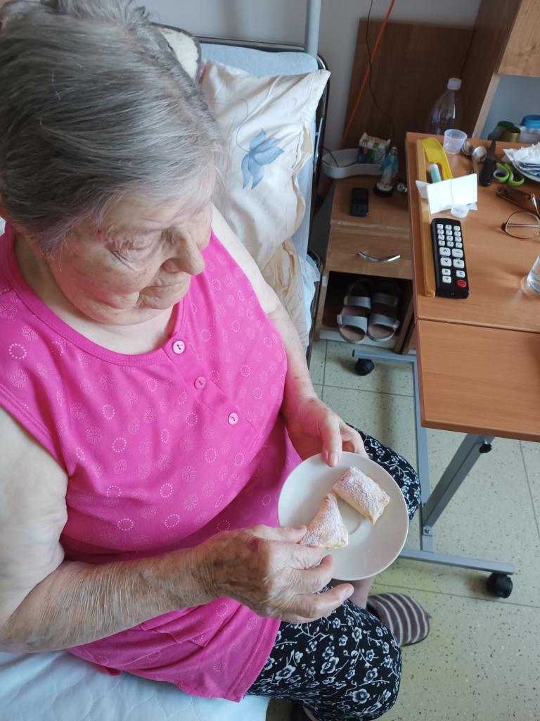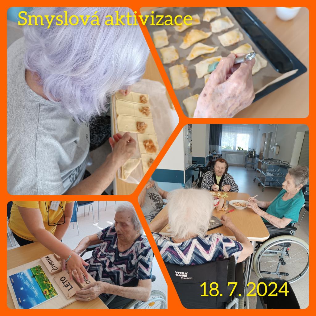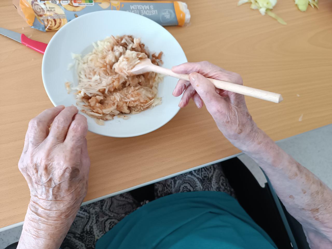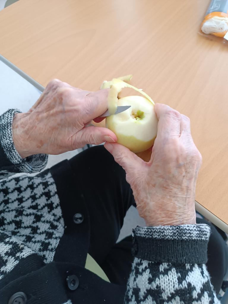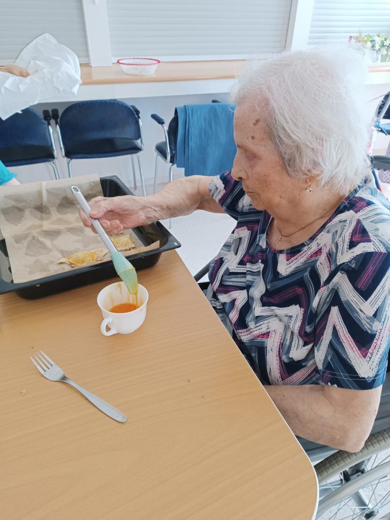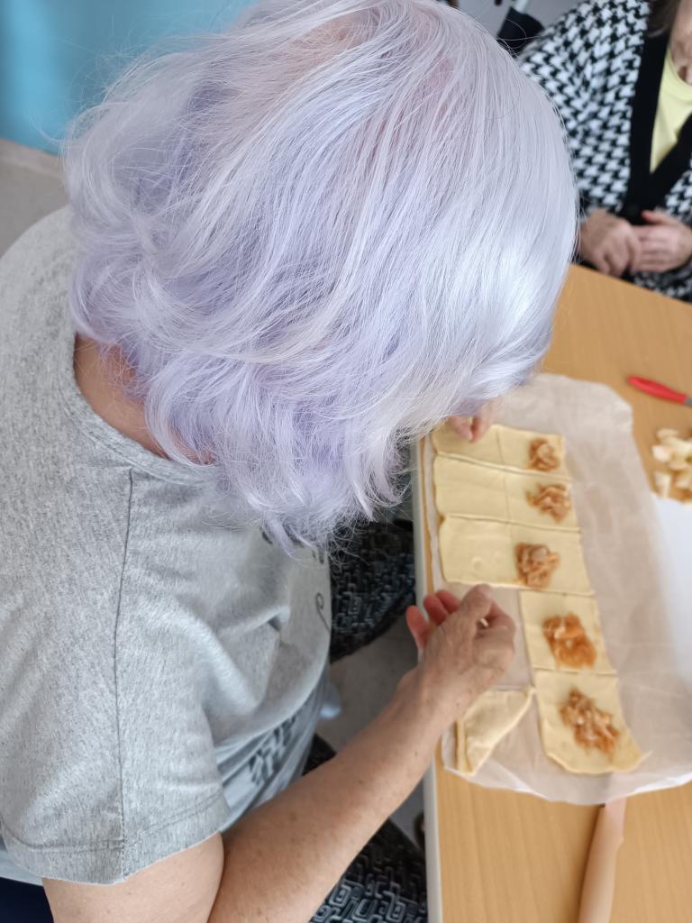 Smyslová aktivizace a její dnešní téma jablka. Kdo by si nepamatoval "žňovky"? A právě z nich jsme si společně připravili chutné taštičky. Zavzpomínali jsme na mládí, zazpívali písničky a na závěr ochutnali výsledek naší práce.