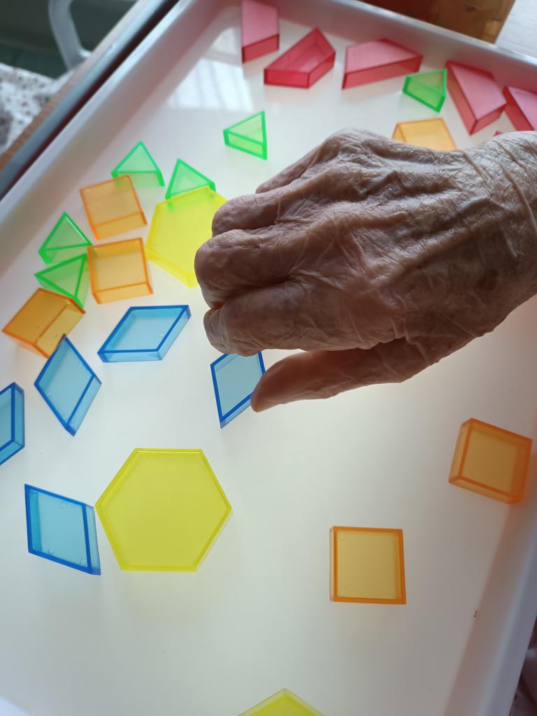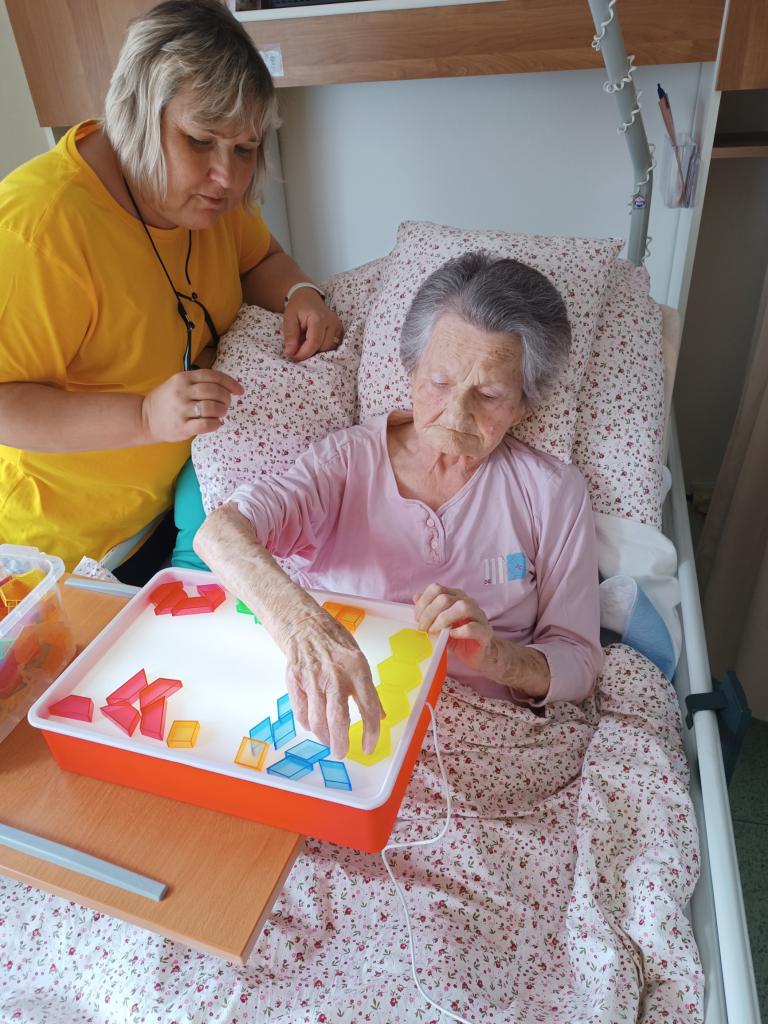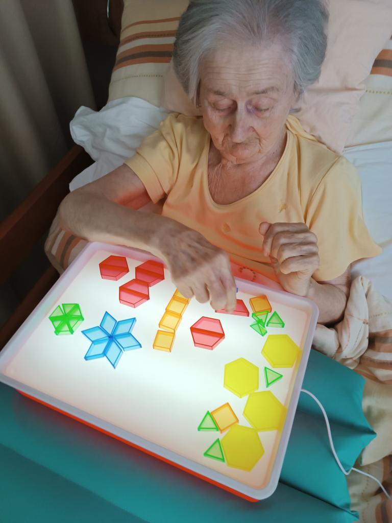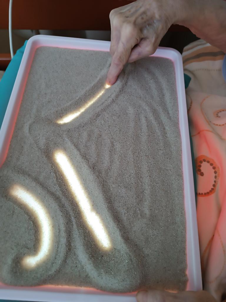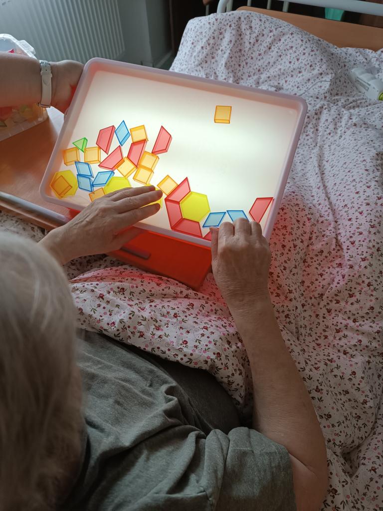 Klienti si v rámci individuálních aktivit vyzkoušeli nově pořízený světelný stůl s různými tvary a jemným pískem. Aktivita u světelného stolu podporuje smysly a motorické dovednosti.