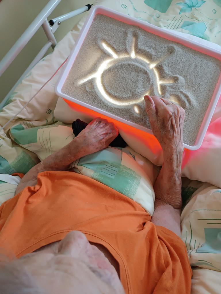 Na pokojích klientů jsme se pondělní dopoledne zaměřili na trénink jemné motoriky za podpory speciálních pomůcek.