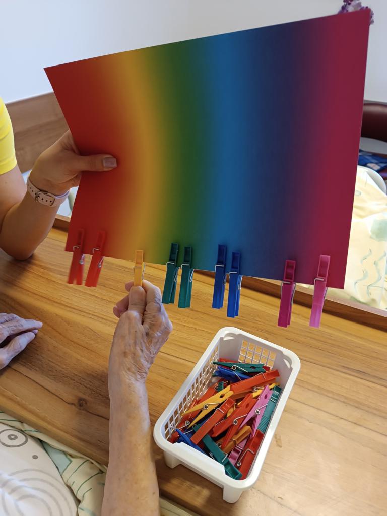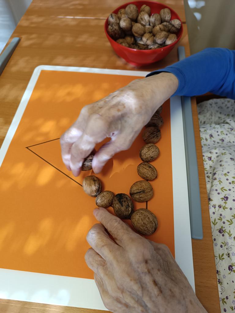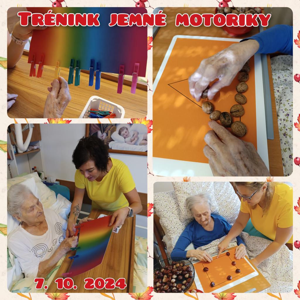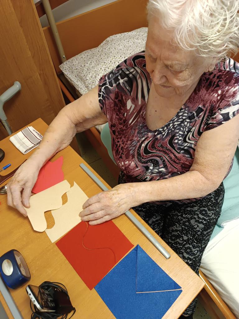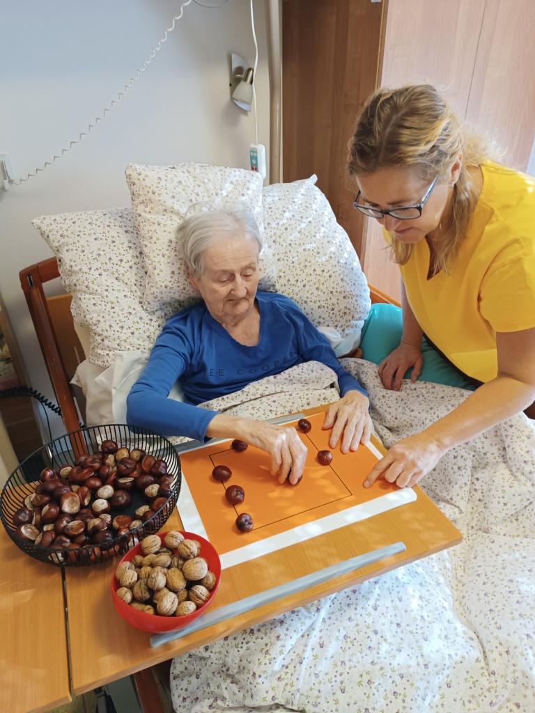 Trénink jemné motoriky spojený s podzimní tématikou. Klientky na pokojích procvičily nejen ruce, ale i paměť a zavzpomínaly na tradice spojené s podzimem.