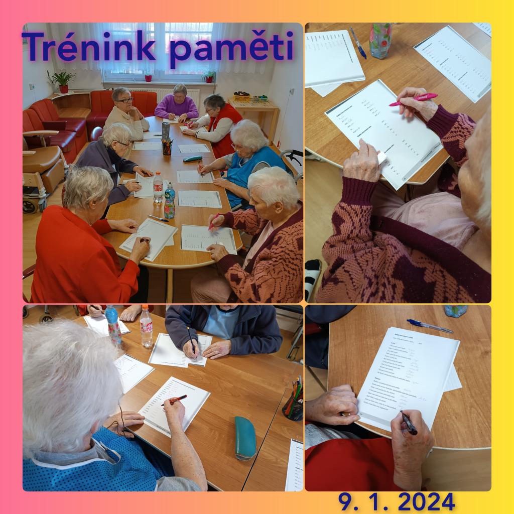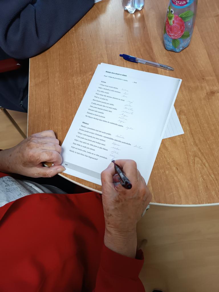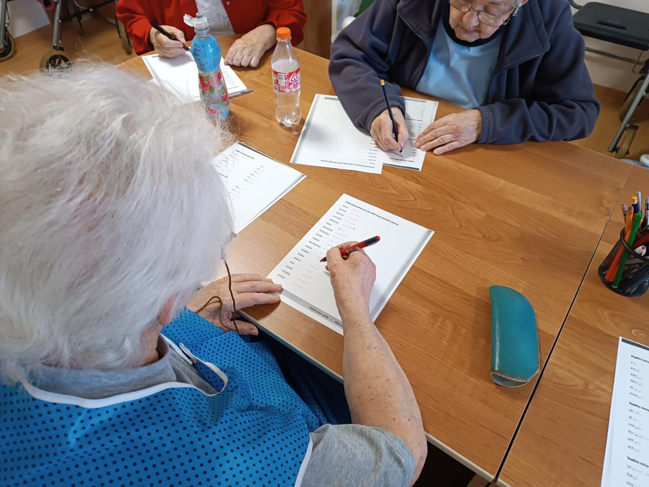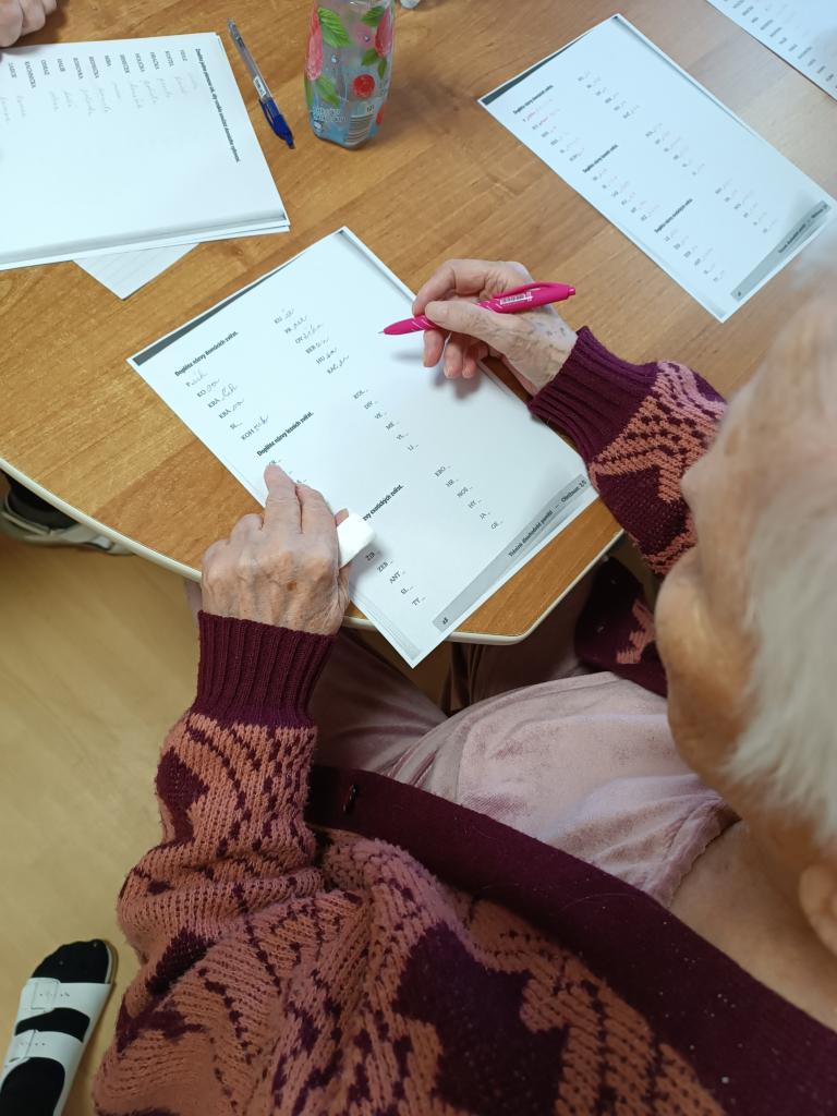 Při dopoledním společném tréninku paměti si klientky procvičily dlouhodobou paměť, slovní zásobu a trénink pozornosti. Stejná cvičení vyplňují i někteří klienti na svých pokojích.