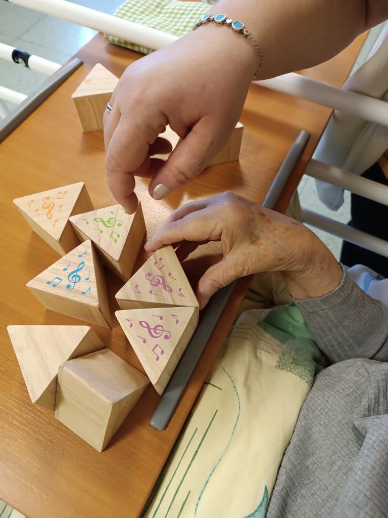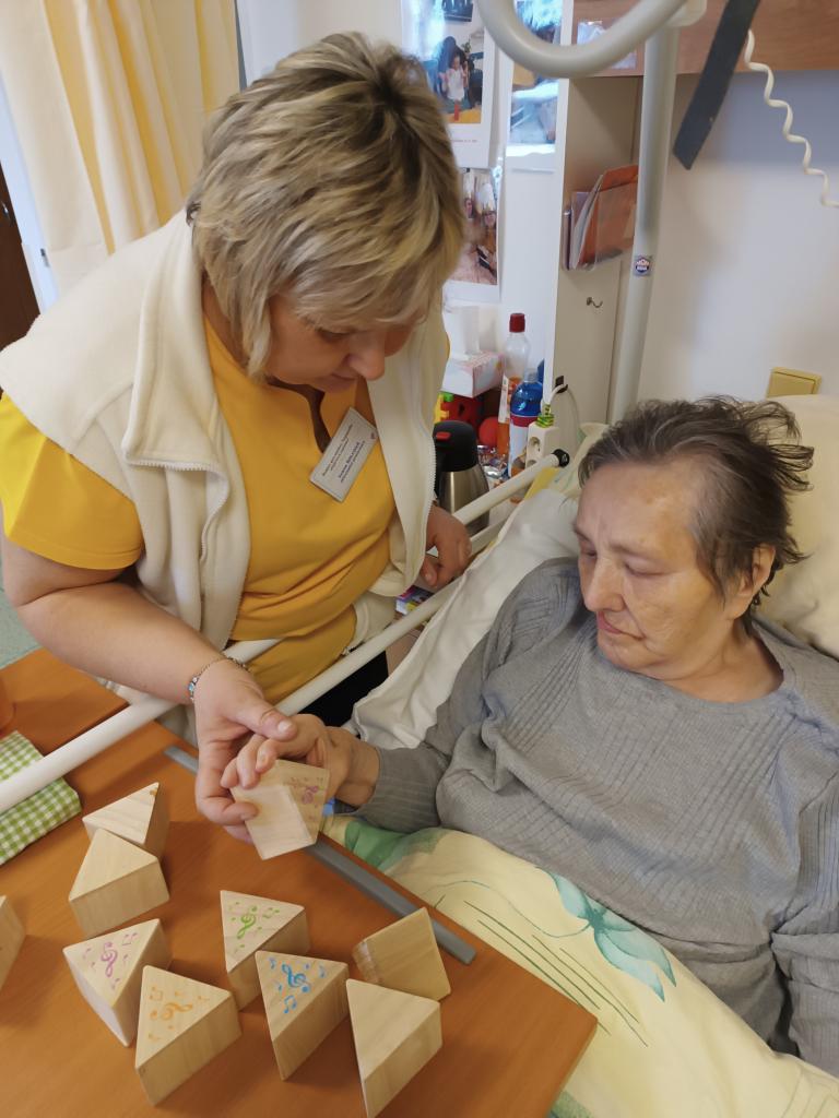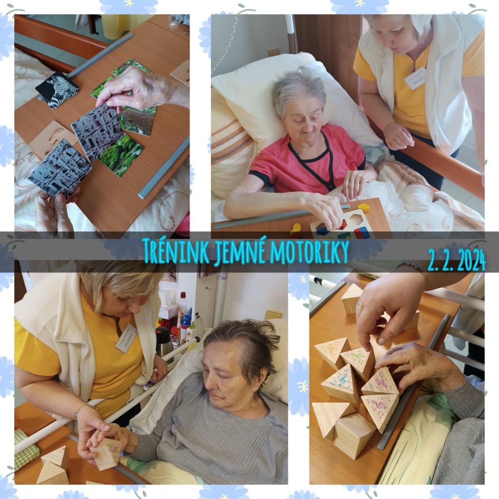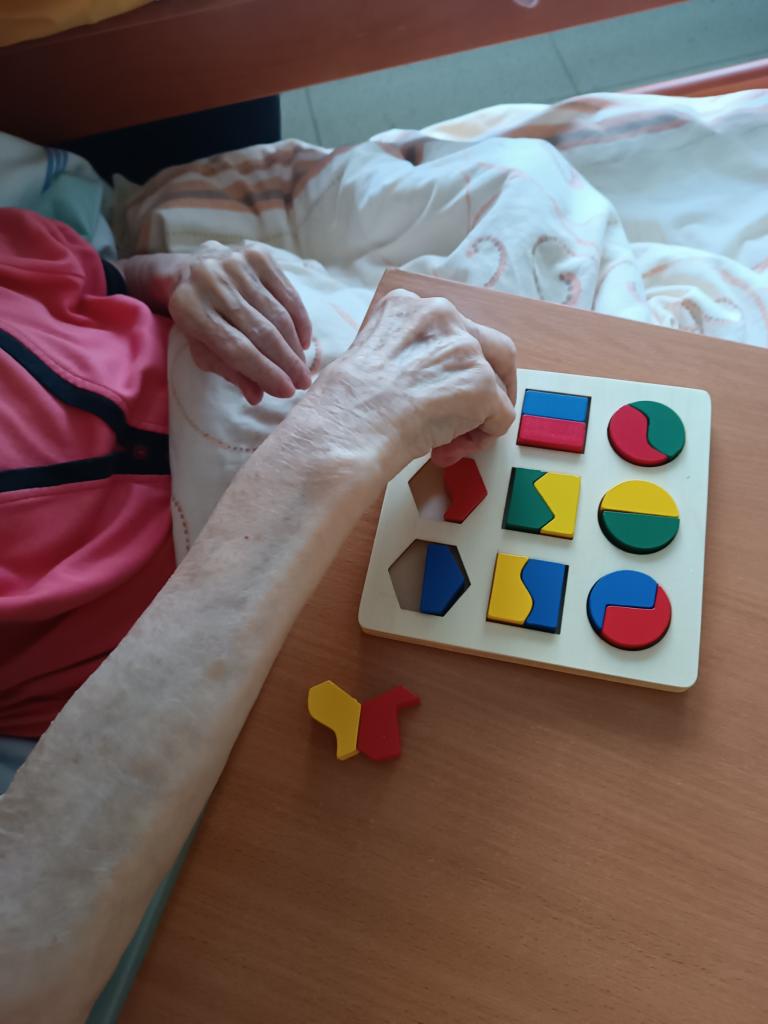 K zachování a udržení zručnosti a soběstačnosti využíváme u našich klientů pomůcky, kterými trénují jemnou motoriku. Různé kostky nebo smyslové polštáře jim pomáhají s procvičením a uvolněním prstů.