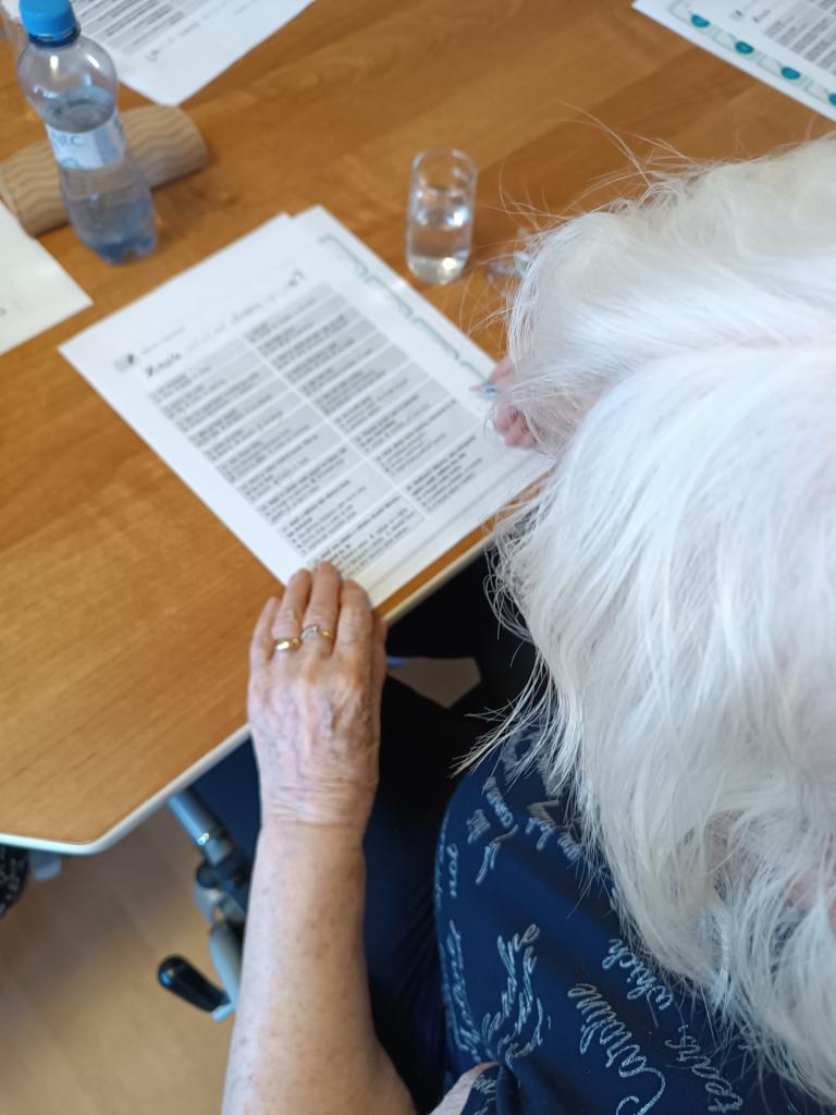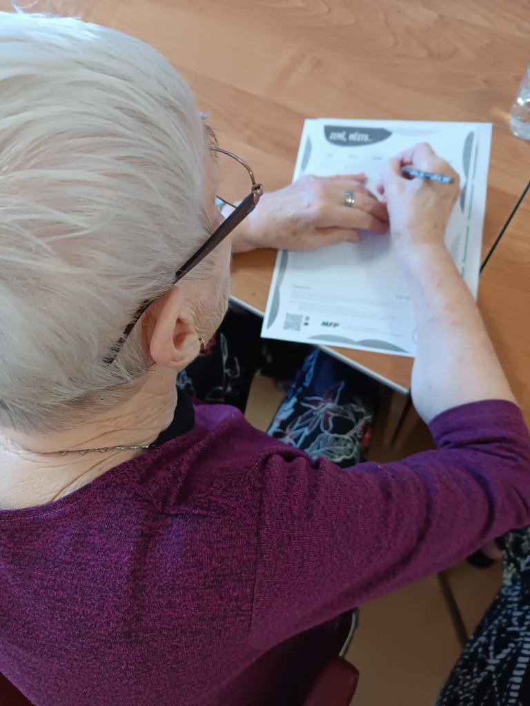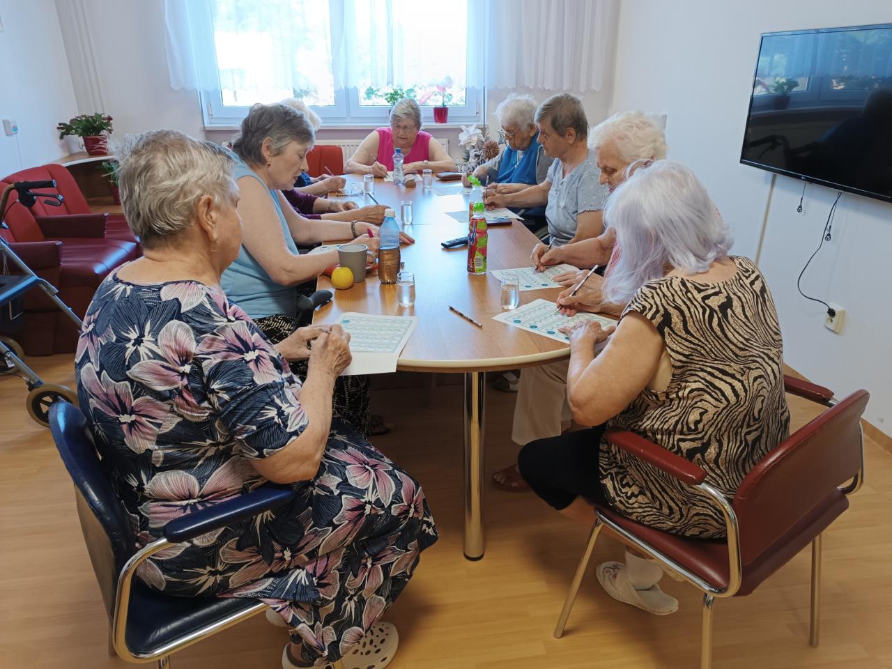 Ani teplé počasí neodradilo klienty od setkání u kvízů a početních úloh. Klienti si nejen bystří paměť, ale psaním trénují také jemnou motoriku.