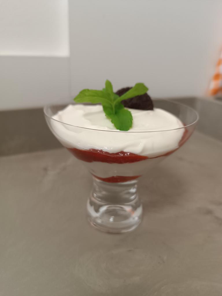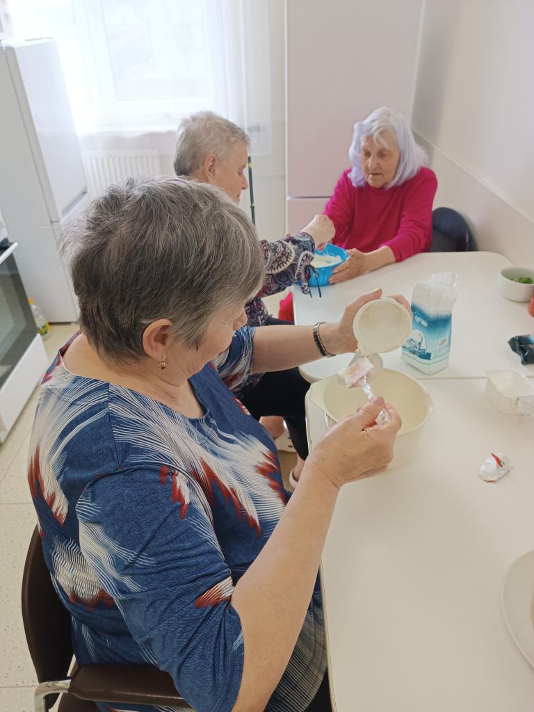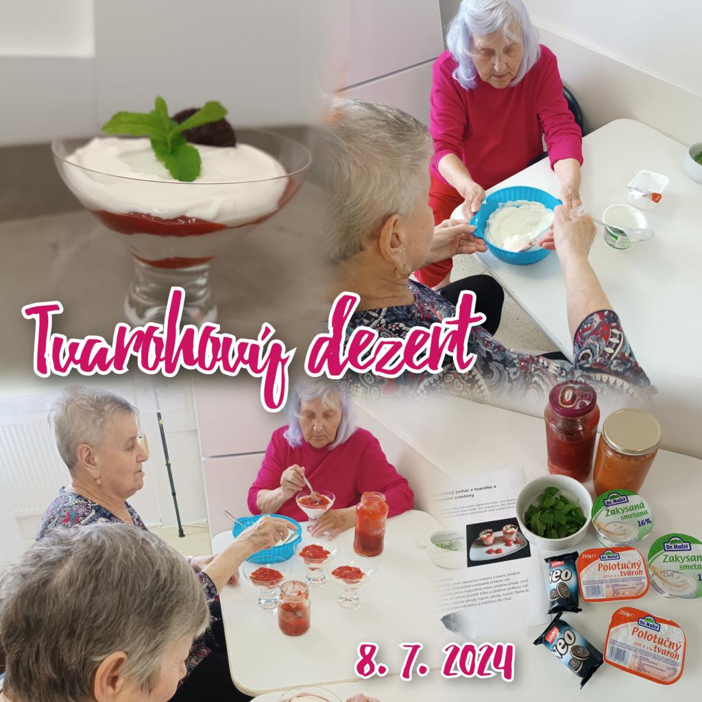 Pondělní dopoledne jsme jako již tradičně strávili v kuchyni. Připravili jsme tvarohový dezert s jahodovým rozvarem, který bude sloužit jako pohoštění při zítřejší oslavě jubilantů.