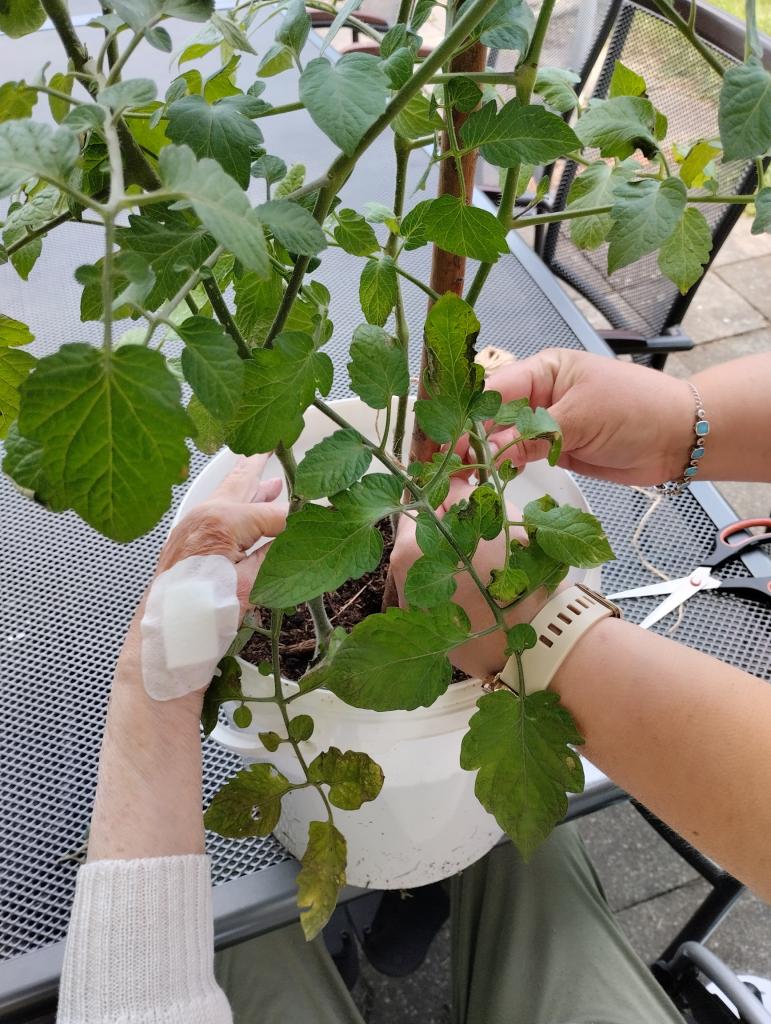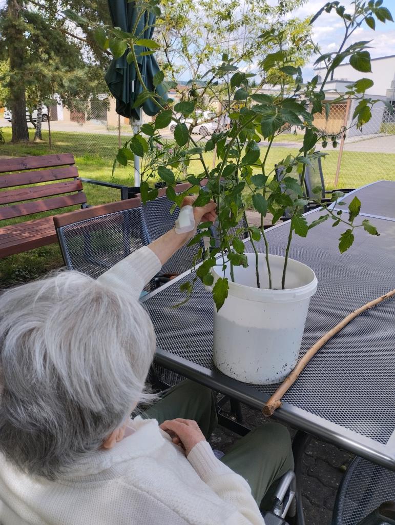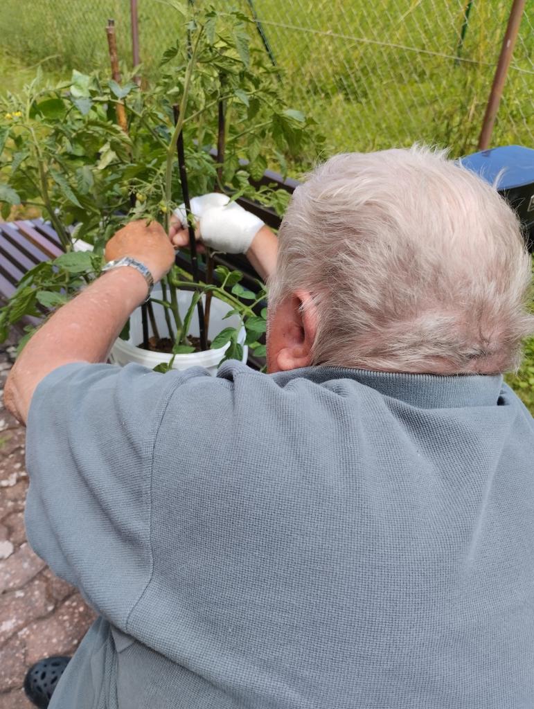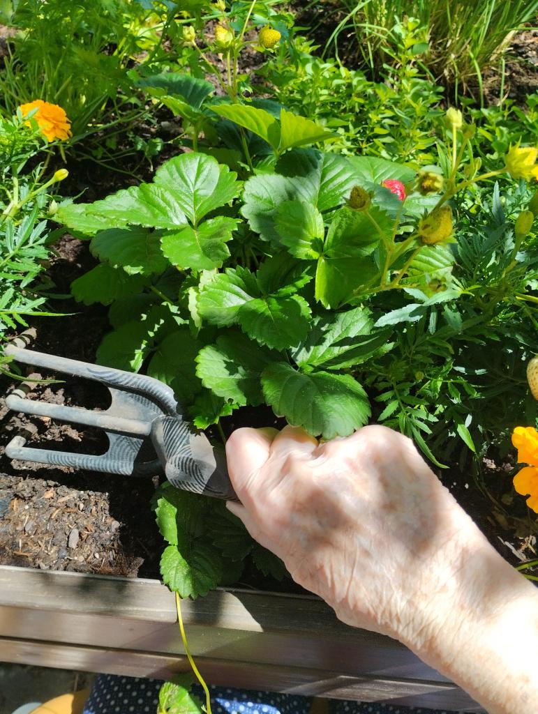 Práce na naší zahradě je stále dost. Ať už je to odstranění odkvetlých květů, přivazování rajčat a paprik nebo zkypření hlíny v bylinkových vyvýšených záhonech.