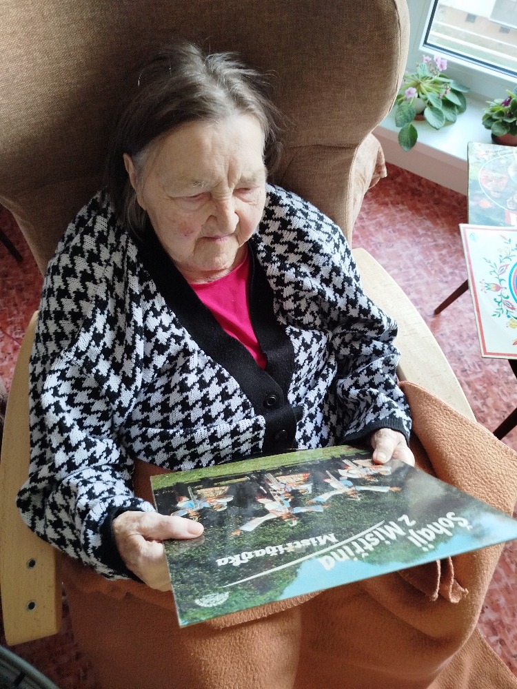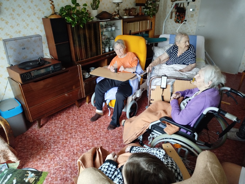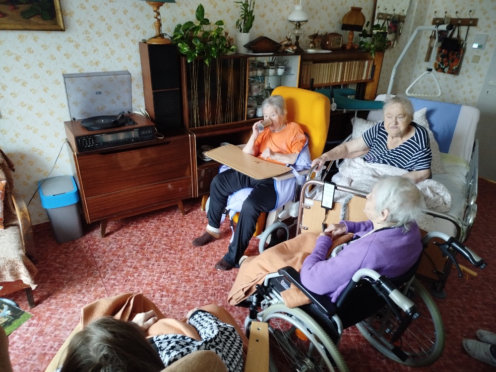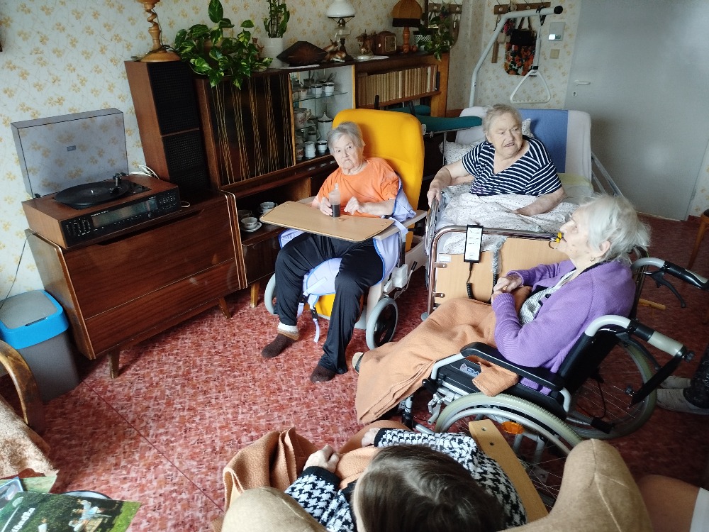 Společenská místnost ve IV. patře je zařízena jako reminiscenční - vzpomínková. Klientům je zde k dispozici i gramofon, na kterém jsme si pouštěli písničky na přání.